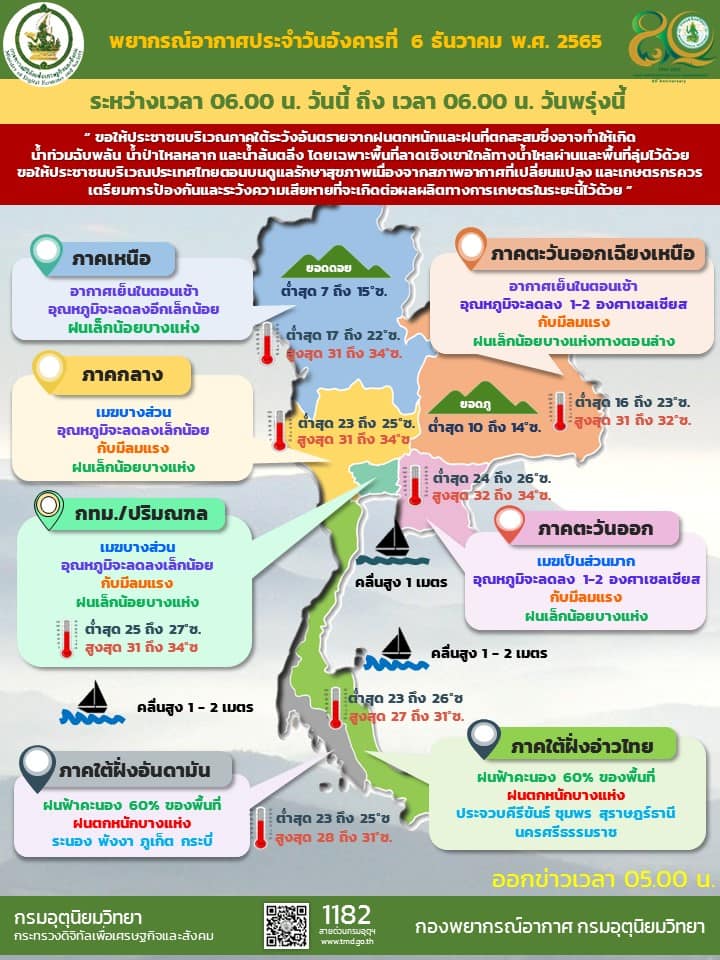 08.00 กรมอุตุฯ เผยไทยตอนบนอุณหภูมิลด 1-2 องศา ส่วนภาคใต้มีฝนหนักบางแห่ง เตือนน้ำท่วมฉับพลัน