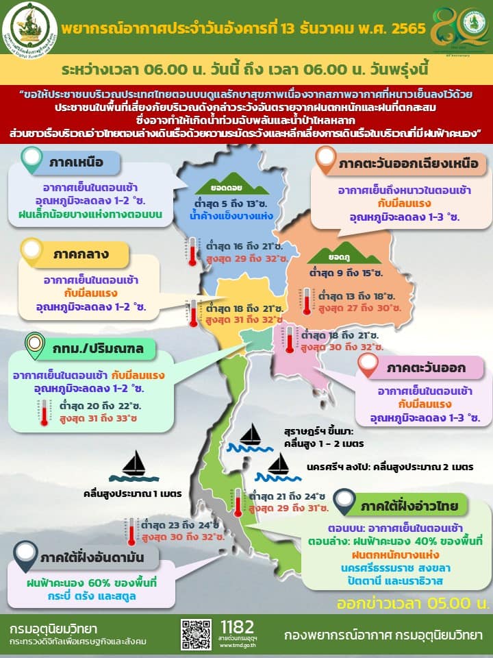08.00 กรมอุตุฯเผย ประเทศไทยตอนบน อุณหภูมิลดลง 1-3 องศา ส่วนภาคใต้ยังมีมรสุมฝนตกหนักบางแห่ง