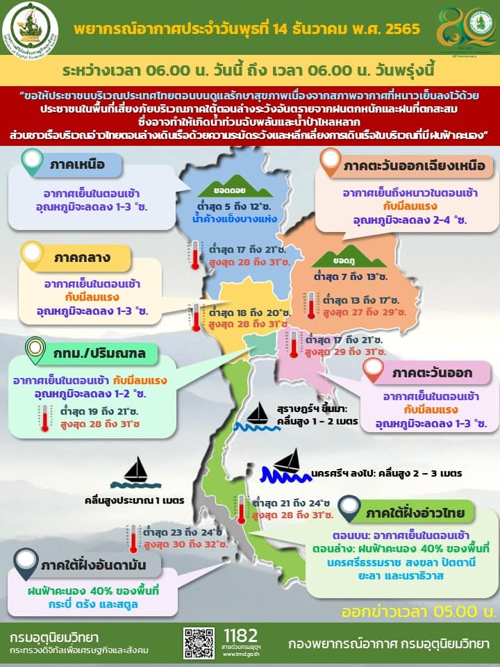 08.00 กรมอุตุฯ เผยประเทศไทยตอนบน อุณหภูมิลดลง 2-4 กทม.สัมผัสอากาศเย็นตอนเช้า ภาคใต้มีฝนฟ้าคะนอง คลื่นสูง 3 เมตร