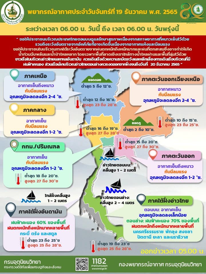 08.00 กรมอุตุนิยมฯ เผยประเทศไทยตอนบนอุณหภูมิลดลงอีก 2-4 องศา ภาคใต้ฝนตกหนักหลายพื้นที่