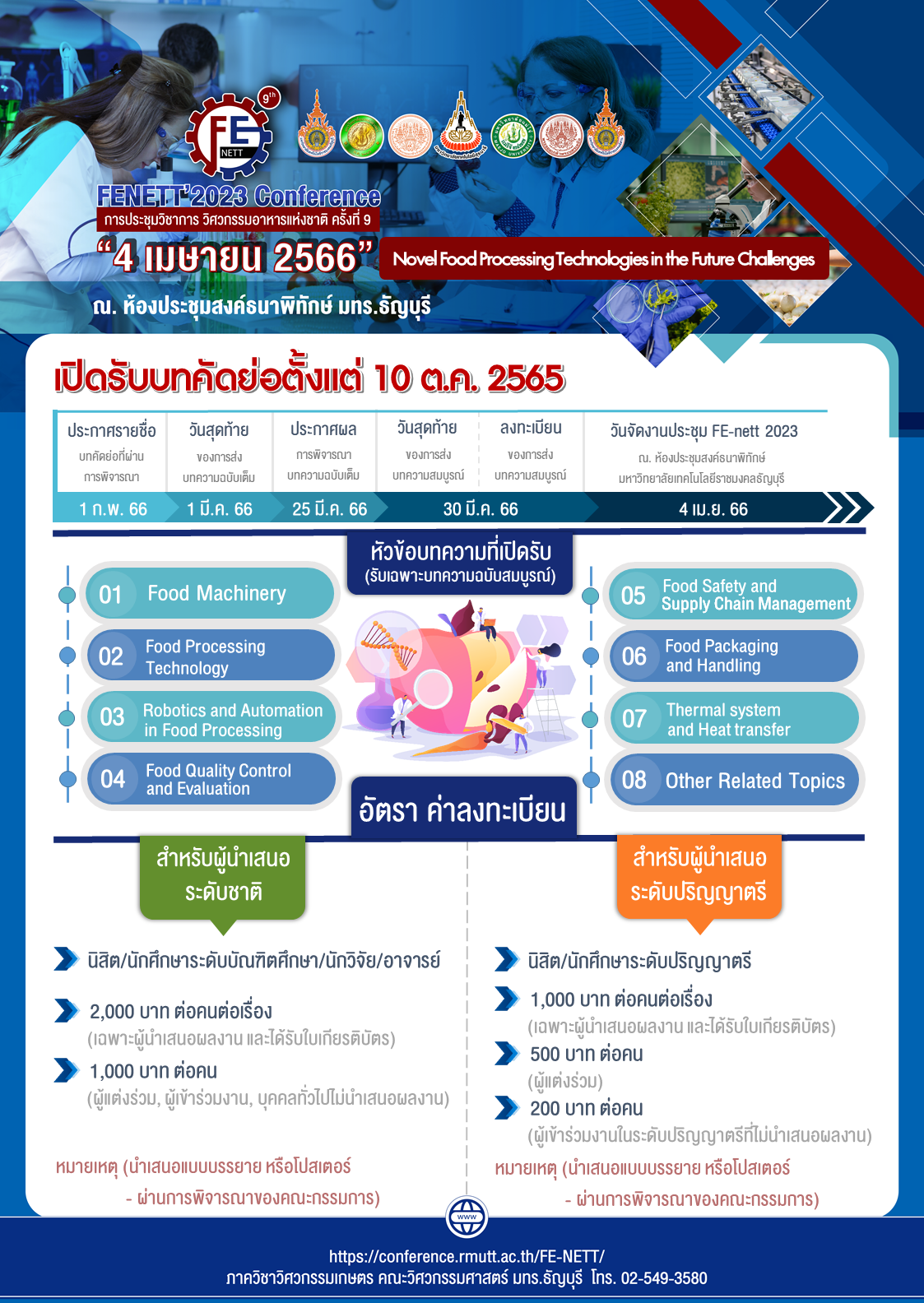 สำหรับการลงทะเบียนเข้าร่วมงาน มีอัตราค่าลงทะเบียน ดังนี้ กรณีผู้นำเสนอ ระดับชาติ : นิสิต/นักศึกษาระดับบัณฑิตศึกษา/นักวิจัย/อาจารย์ 2,000 บาทต่อคนต่อเรื่อง (เฉพาะผู้นำเสนอผลงานและได้รับใบเกียรติบัตร) 1,000 บาทต่อคน (ผู้แต่งร่วม, ผู้เข้าร่วมงาน, บุคคลทั่วไปที่ไม่นำเสนอผลงาน) /กรณีผู้นำเสนอ ระดับปริญญาตรี : นิสิต/นักศึกษาระดับปริญญา 1,000 บาทต่อคนต่อเรื่อง (เฉพาะผู้นำเสนอผลงานและได้รับใบเกียรติบัตร) 500 บาทต่อคน (ผู้แต่งร่วม) 200 บาทต่อคน (ผู้เข้าร่วมงานในระดับปริญญาตรีที่ไม่นำเสนอผลงาน) สอบถามข้อมูลได้ที่ ภาควิชาวิศวกรรมเกษตร คณะวิศวกรรมศาสตร์ มทร.ธัญบุรี 0-2549-3580