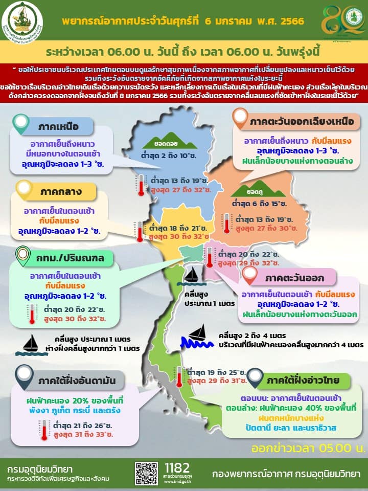 08.00 ประกาศกรมอุตุนิยมวิทยา ฉบับที่ 5 เรื่อง ฝนตกหนักถึงหนักมากบริเวณภาคใต้ และคลื่นลมแรงบริเวณอ่าวไทย