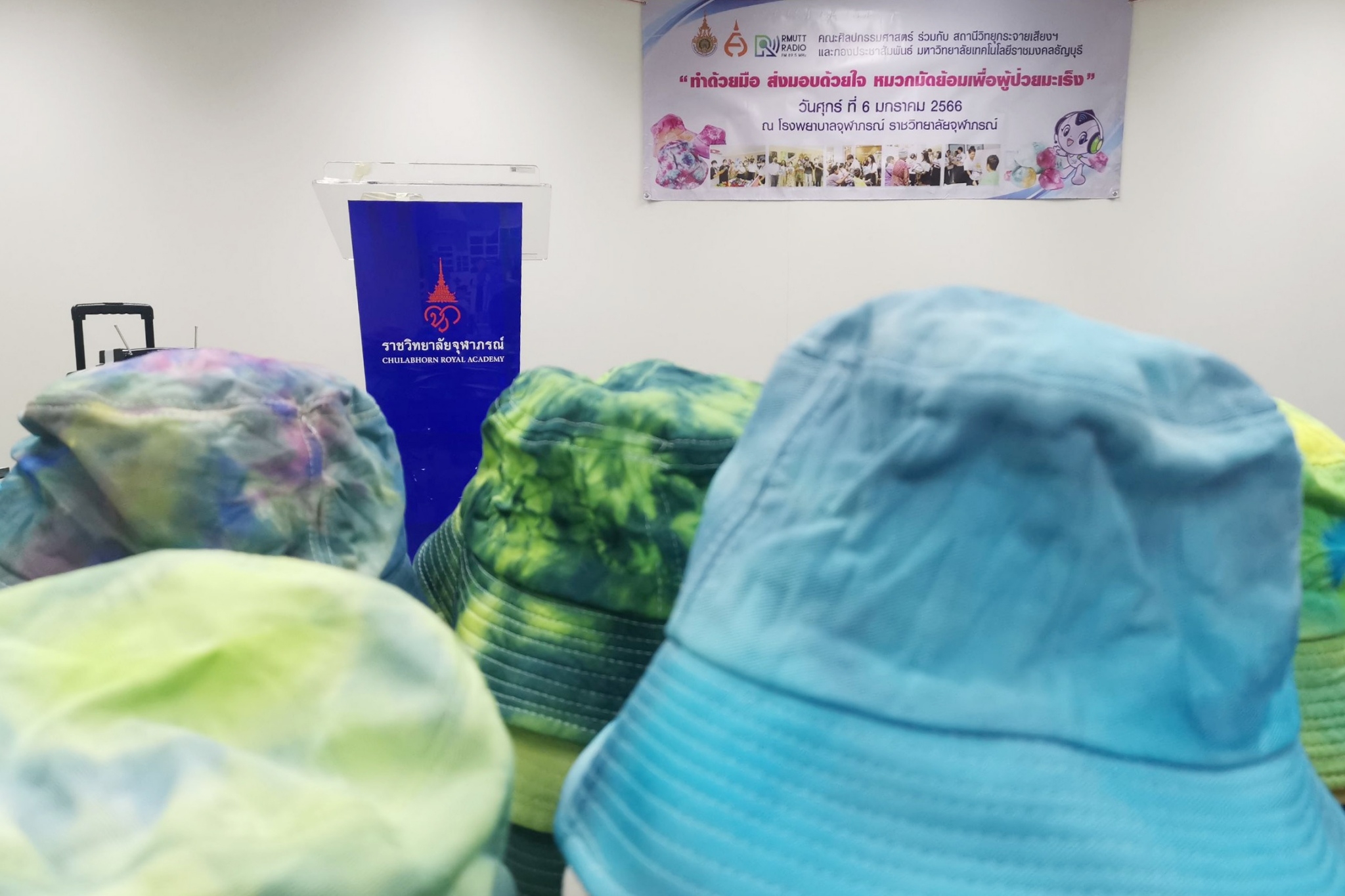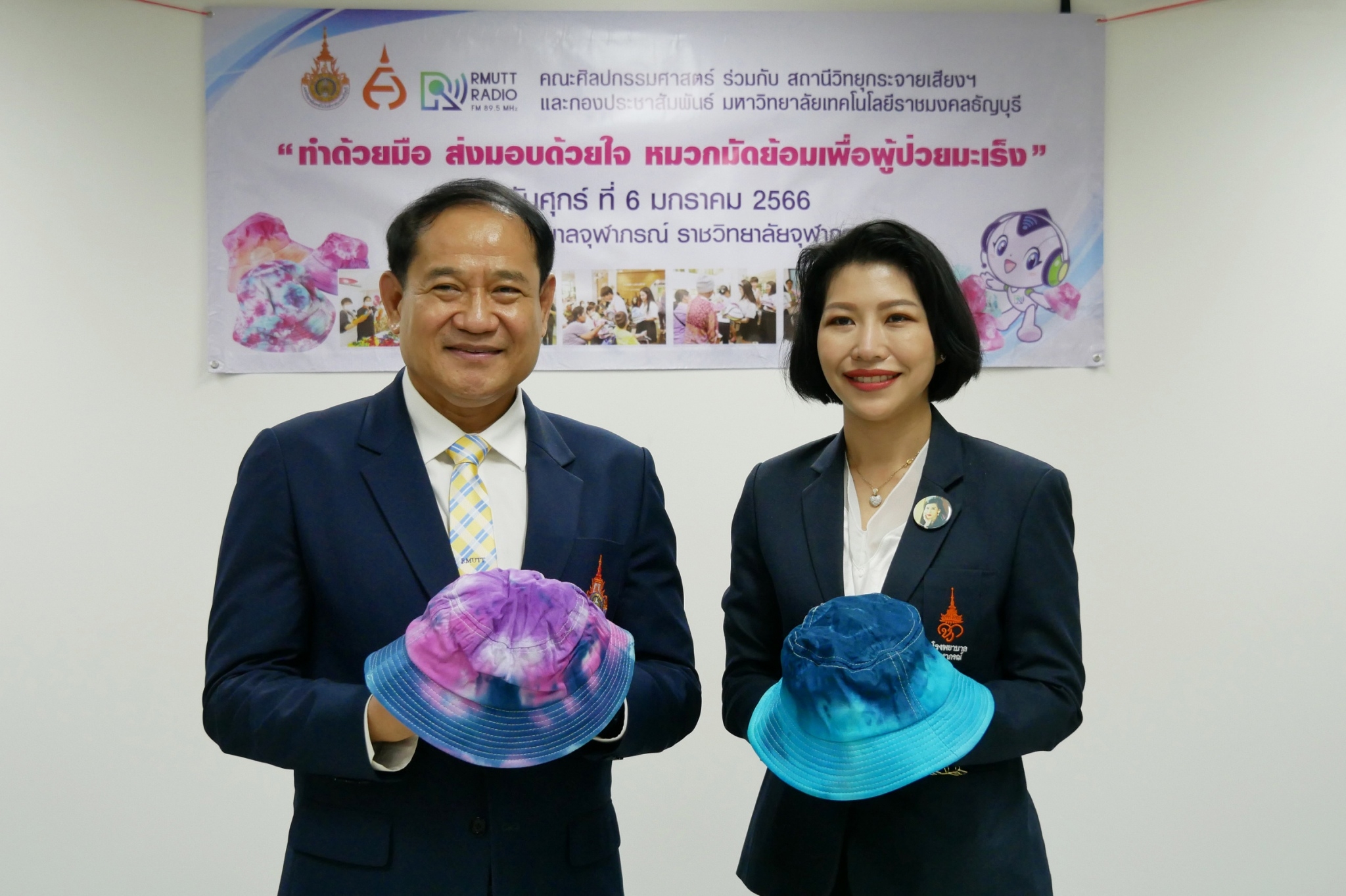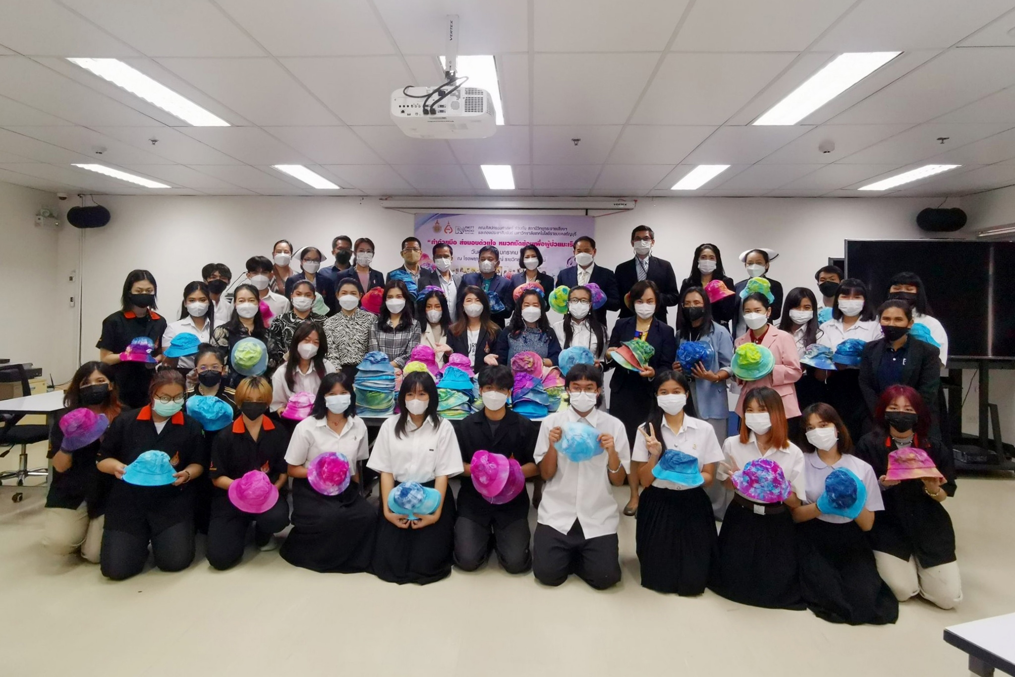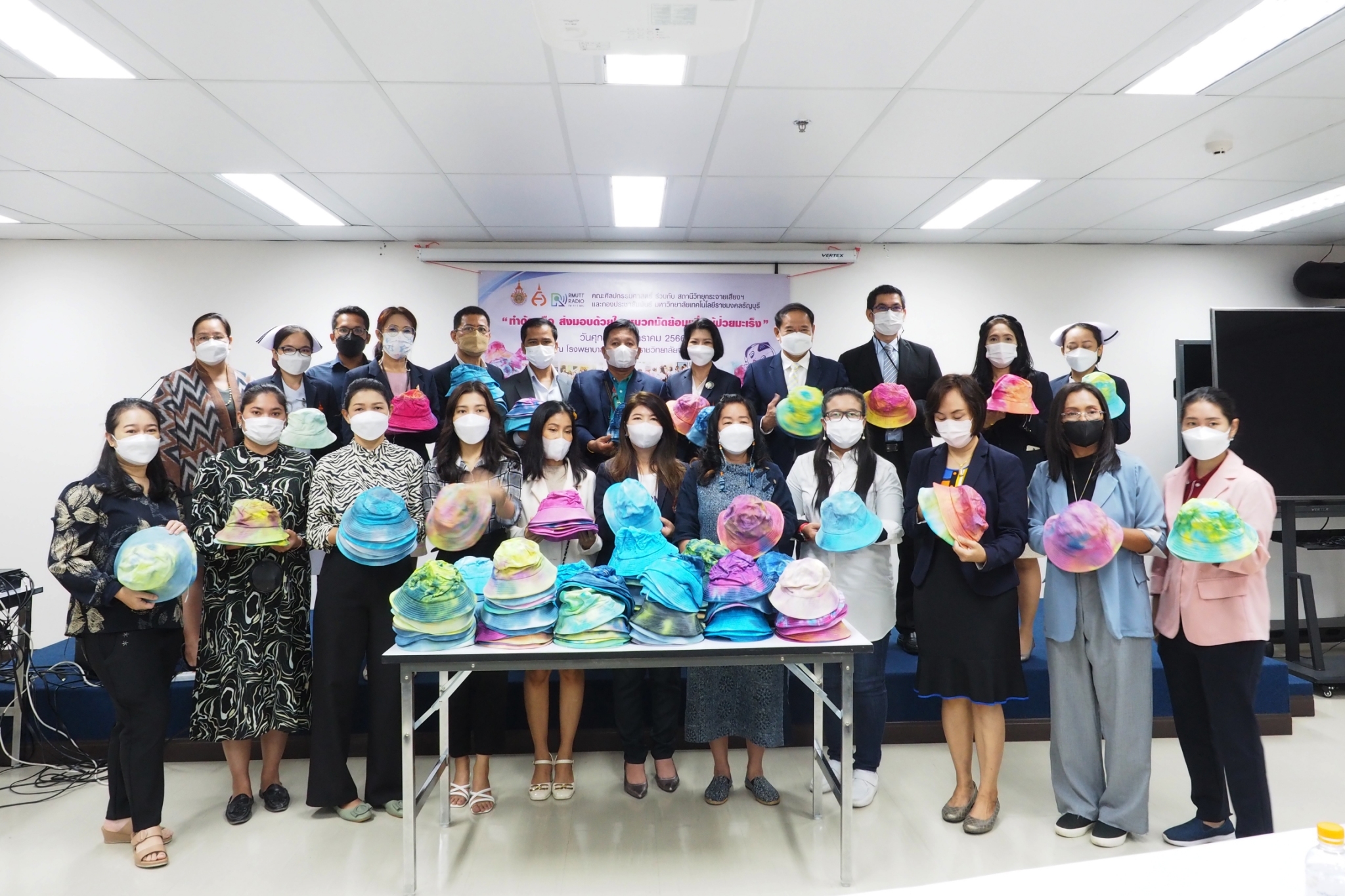 สำหรับโครงการ “ทำด้วยมือ ส่งมอบด้วยใจ หมวกมัดย้อมเพื่อผู้ป่วยมะเร็ง” ได้ริเริ่มขึ้นตั้งแต่ปี 2562 โดยสาขาวิชาการออกแบบแฟชั่นและศิลปะสิ่งทอ คณะศิลปกรรมศาสตร์ มทร.ธัญบุรี มีจุดมุ่งหมายในการจัดทำหมวกมัดย้อมเพื่อส่งมอบให้กับผู้ป่วยโรคมะเร็งในสถานพยาบาลต่างๆ เนื่องจากเล็งเห็นว่า เมื่อผู้ป่วยมะเร็งได้เข้ารับการรักษาโรค ในขั้นตอนของการทำเคมีบำบัด ผลจากการรักษาจะทำให้เกิดอาการข้างเคียง คือ ผมร่วง การใส่วิกผมระหว่างการรักษามะเร็ง เป็นวิธีการอำพรางและป้องกันศีรษะ สามารถช่วยรักษาภาพลักษณ์ทางสุขภาพและสภาวะที่ปกติ แต่การใส่วิกผมในผู้ป่วยบางรายนั้น อาจทำให้ร้อนเกินไปหรือใช้เวลานานในการจัดทรง การใส่หมวกจึงเป็นอีกทางเลือกหนึ่ง สำหรับหมวกมัดย้อมที่จัดทำขึ้นครั้งนี้ เป็นผลงานของนักศึกษาสาขาวิชาจิตรกรรมสากลชั้นปีที่ 4 ที่ลงทะเบียนเรียนในรายวิชา “ออกแบบตกแต่งผ้าและการย้อมสี” และนักเรียนจิตอาสาจาก ร.ร.สวนกุหลาบวิทยาลัย รังสิต นับเป็นการลงมือปฏิบัติโดยนำศาสตร์ที่ได้เรียนไปประยุกต์ให้เกิดประโยชน์ เสริมสร้างจิตสำนึกในการมีจิตอาสาเพื่อการช่วยเหลือสังคม