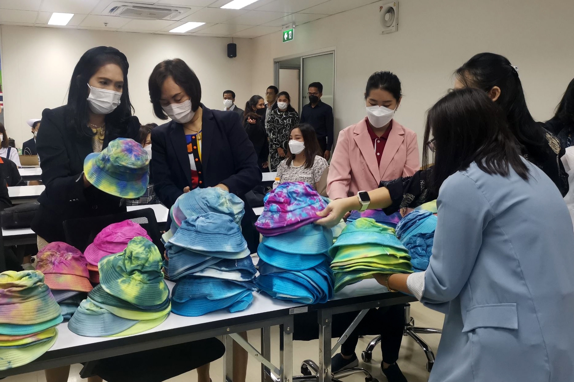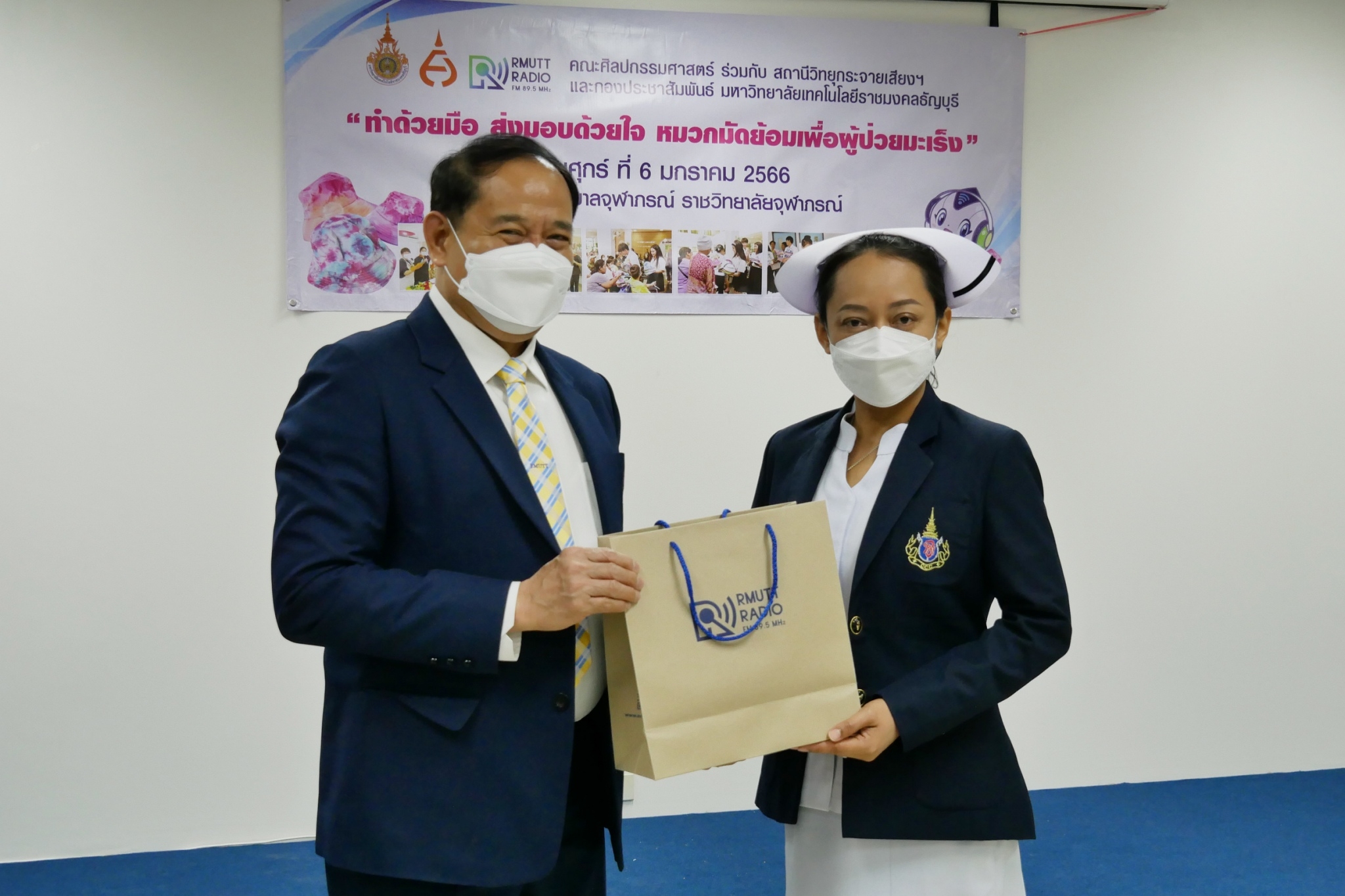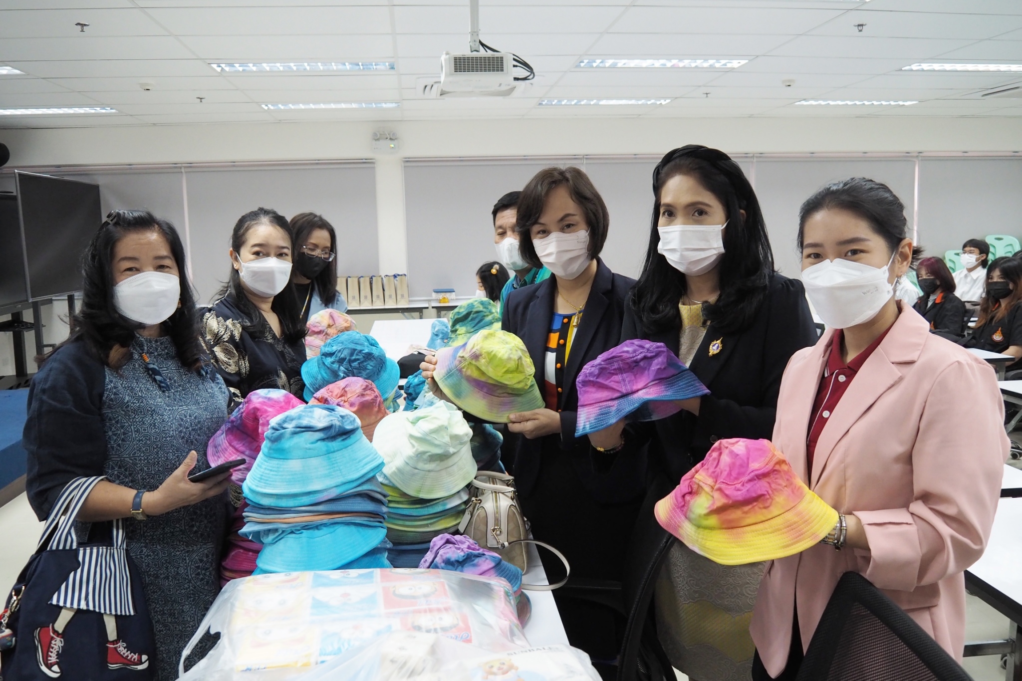 สำหรับโครงการ “ทำด้วยมือ ส่งมอบด้วยใจ หมวกมัดย้อมเพื่อผู้ป่วยมะเร็ง” ได้ริเริ่มขึ้นตั้งแต่ปี 2562 โดยสาขาวิชาการออกแบบแฟชั่นและศิลปะสิ่งทอ คณะศิลปกรรมศาสตร์ มทร.ธัญบุรี มีจุดมุ่งหมายในการจัดทำหมวกมัดย้อมเพื่อส่งมอบให้กับผู้ป่วยโรคมะเร็งในสถานพยาบาลต่างๆ เนื่องจากเล็งเห็นว่า เมื่อผู้ป่วยมะเร็งได้เข้ารับการรักษาโรค ในขั้นตอนของการทำเคมีบำบัด ผลจากการรักษาจะทำให้เกิดอาการข้างเคียง คือ ผมร่วง การใส่วิกผมระหว่างการรักษามะเร็ง เป็นวิธีการอำพรางและป้องกันศีรษะ สามารถช่วยรักษาภาพลักษณ์ทางสุขภาพและสภาวะที่ปกติ แต่การใส่วิกผมในผู้ป่วยบางรายนั้น อาจทำให้ร้อนเกินไปหรือใช้เวลานานในการจัดทรง การใส่หมวกจึงเป็นอีกทางเลือกหนึ่ง สำหรับหมวกมัดย้อมที่จัดทำขึ้นครั้งนี้ เป็นผลงานของนักศึกษาสาขาวิชาจิตรกรรมสากลชั้นปีที่ 4 ที่ลงทะเบียนเรียนในรายวิชา “ออกแบบตกแต่งผ้าและการย้อมสี” และนักเรียนจิตอาสาจาก ร.ร.สวนกุหลาบวิทยาลัย รังสิต นับเป็นการลงมือปฏิบัติโดยนำศาสตร์ที่ได้เรียนไปประยุกต์ให้เกิดประโยชน์ เสริมสร้างจิตสำนึกในการมีจิตอาสาเพื่อการช่วยเหลือสังคม