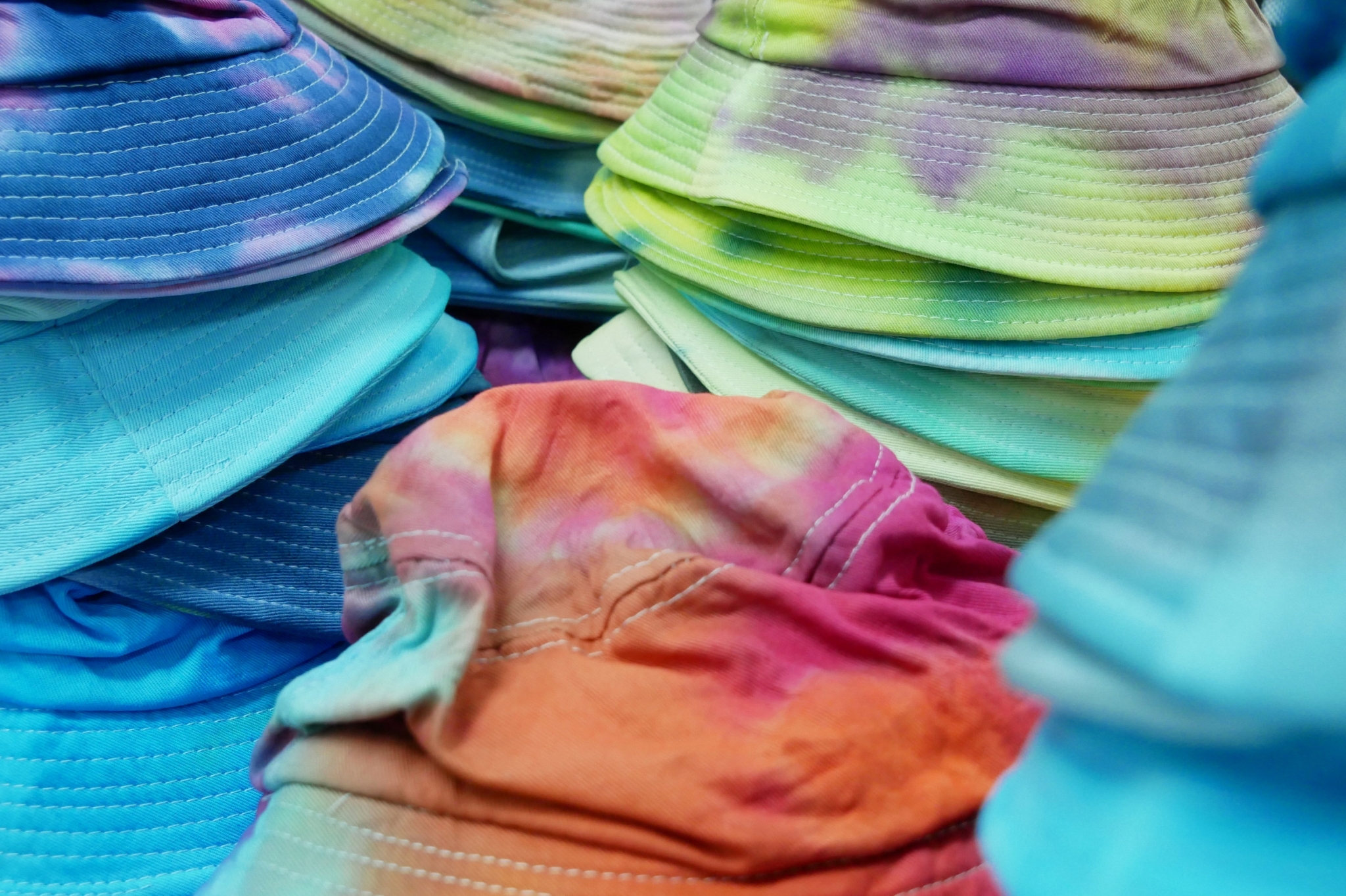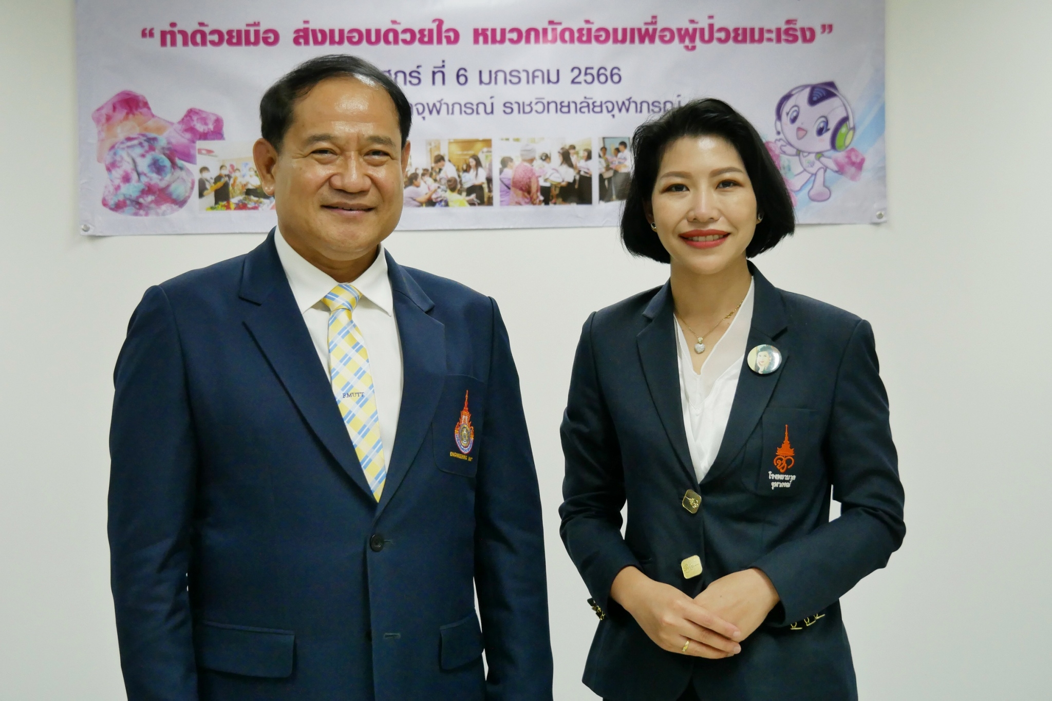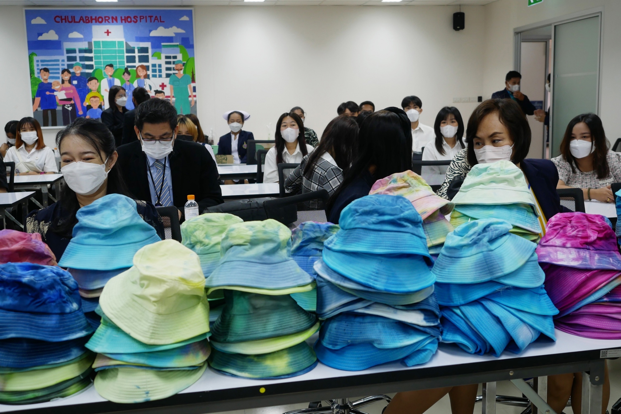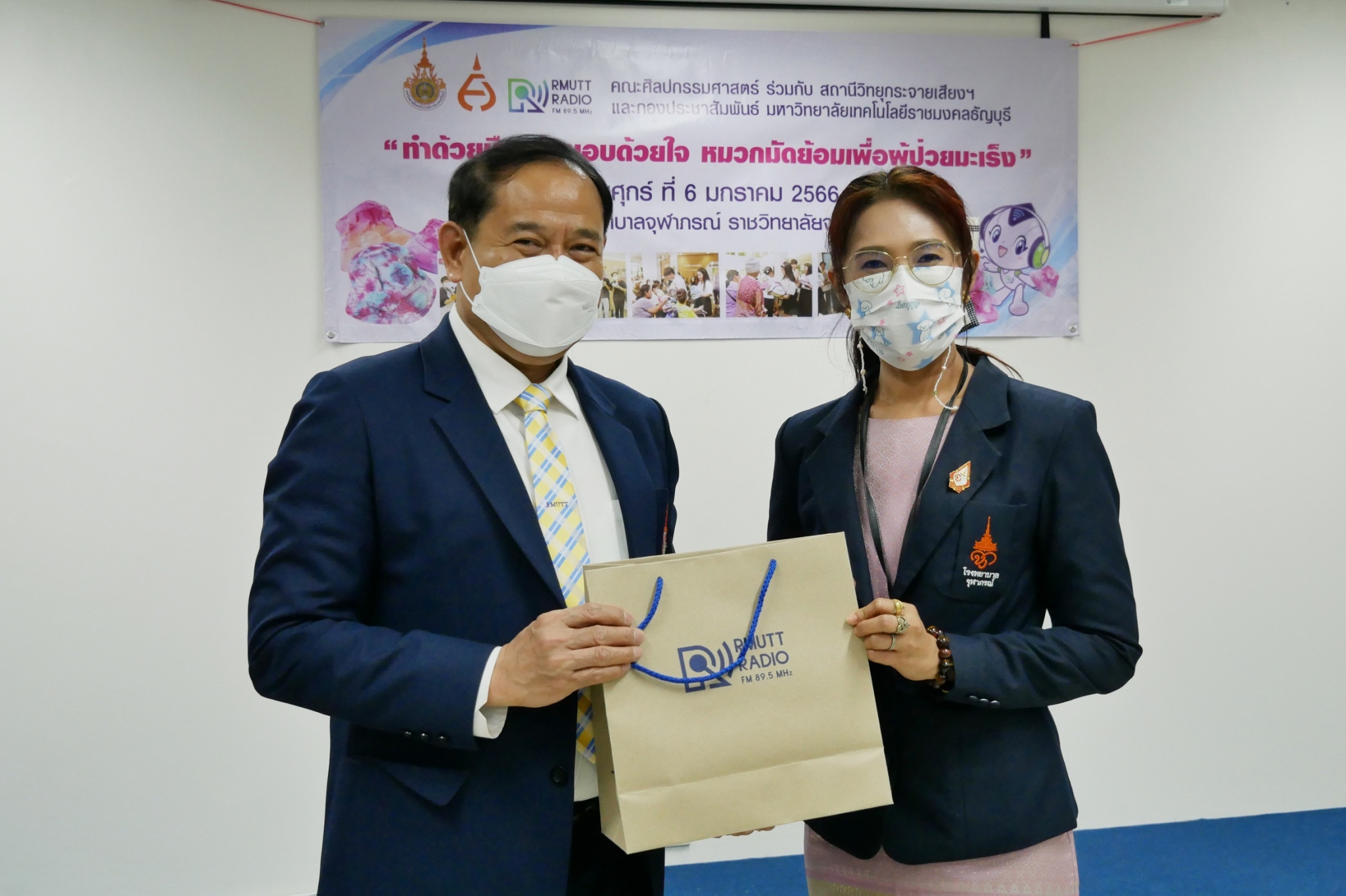 สำหรับโครงการ “ทำด้วยมือ ส่งมอบด้วยใจ หมวกมัดย้อมเพื่อผู้ป่วยมะเร็ง” ได้ริเริ่มขึ้นตั้งแต่ปี 2562 โดยสาขาวิชาการออกแบบแฟชั่นและศิลปะสิ่งทอ คณะศิลปกรรมศาสตร์ มทร.ธัญบุรี มีจุดมุ่งหมายในการจัดทำหมวกมัดย้อมเพื่อส่งมอบให้กับผู้ป่วยโรคมะเร็งในสถานพยาบาลต่างๆ เนื่องจากเล็งเห็นว่า เมื่อผู้ป่วยมะเร็งได้เข้ารับการรักษาโรค ในขั้นตอนของการทำเคมีบำบัด ผลจากการรักษาจะทำให้เกิดอาการข้างเคียง คือ ผมร่วง การใส่วิกผมระหว่างการรักษามะเร็ง เป็นวิธีการอำพรางและป้องกันศีรษะ สามารถช่วยรักษาภาพลักษณ์ทางสุขภาพและสภาวะที่ปกติ แต่การใส่วิกผมในผู้ป่วยบางรายนั้น อาจทำให้ร้อนเกินไปหรือใช้เวลานานในการจัดทรง การใส่หมวกจึงเป็นอีกทางเลือกหนึ่ง สำหรับหมวกมัดย้อมที่จัดทำขึ้นครั้งนี้ เป็นผลงานของนักศึกษาสาขาวิชาจิตรกรรมสากลชั้นปีที่ 4 ที่ลงทะเบียนเรียนในรายวิชา “ออกแบบตกแต่งผ้าและการย้อมสี” และนักเรียนจิตอาสาจาก ร.ร.สวนกุหลาบวิทยาลัย รังสิต นับเป็นการลงมือปฏิบัติโดยนำศาสตร์ที่ได้เรียนไปประยุกต์ให้เกิดประโยชน์ เสริมสร้างจิตสำนึกในการมีจิตอาสาเพื่อการช่วยเหลือสังคม