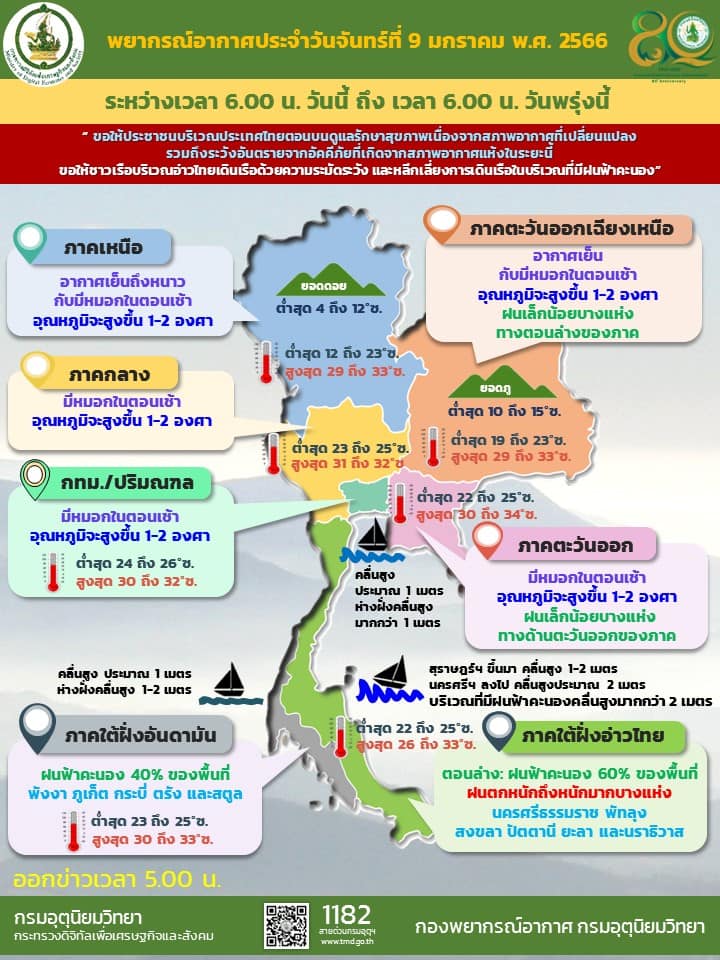 08.00 กรมอุตุฯ เผยประเทศไทยตอนบน อุณหภูมิสูงขึ้น 1-2 องศา ภาคใต้ยังมีฝน ทะเลคลื่นสูง 2 เมตร
