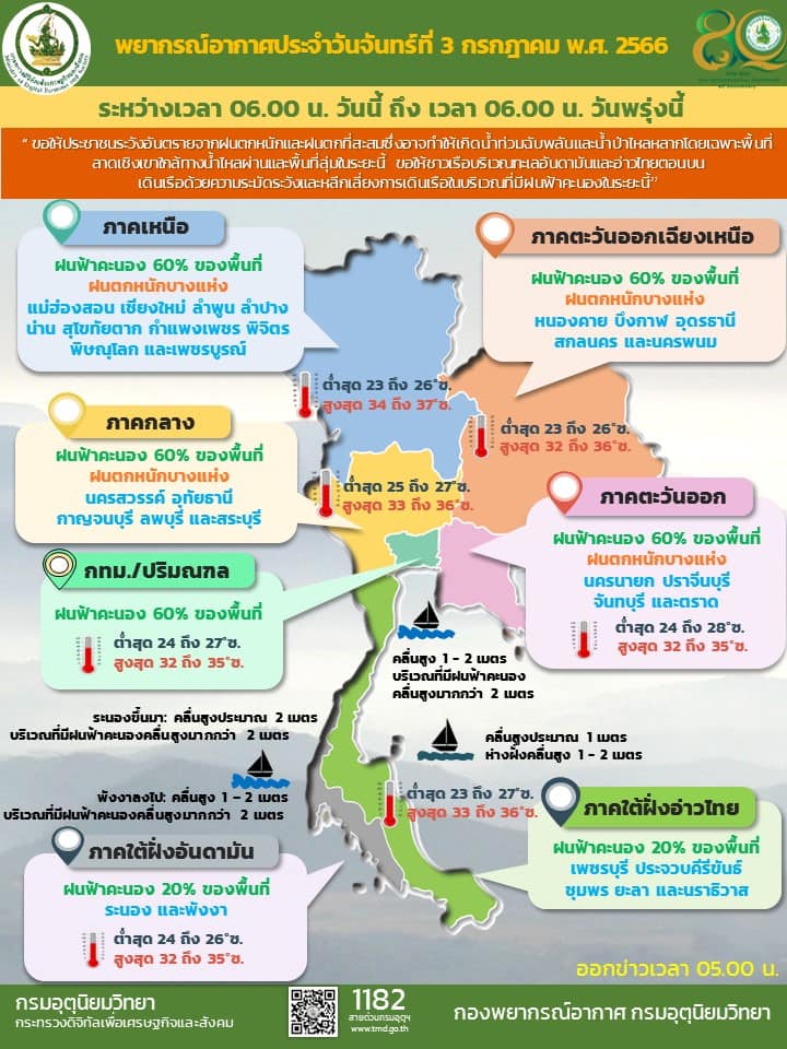 08.00 ประเทศไทยตอนบนมีฝนตกหนักบางแห่ง เตือนระวังน้ำท่วมฉับพลัน ที่ลาดเชิงเขา กรุงเทพและปริมณฑล มีฝนร้อยละ 60 ของพื้นที่