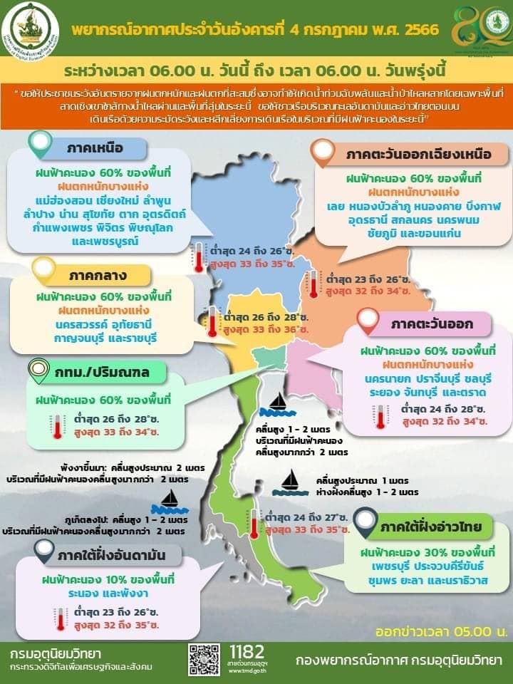 08.00 กรมอุตุเผย ประเทศไทยมีฝนตกในหลายพื้นที่เตือนเฝ้าระวังน้ำท่วมฉับพลัน น้ำป่าไหลหลาก ทะเลมีคลื่นสูง 1-2 เมตร กทม.และปริมณฑล มีฝนร้อยละ 60 ของพื้นที่