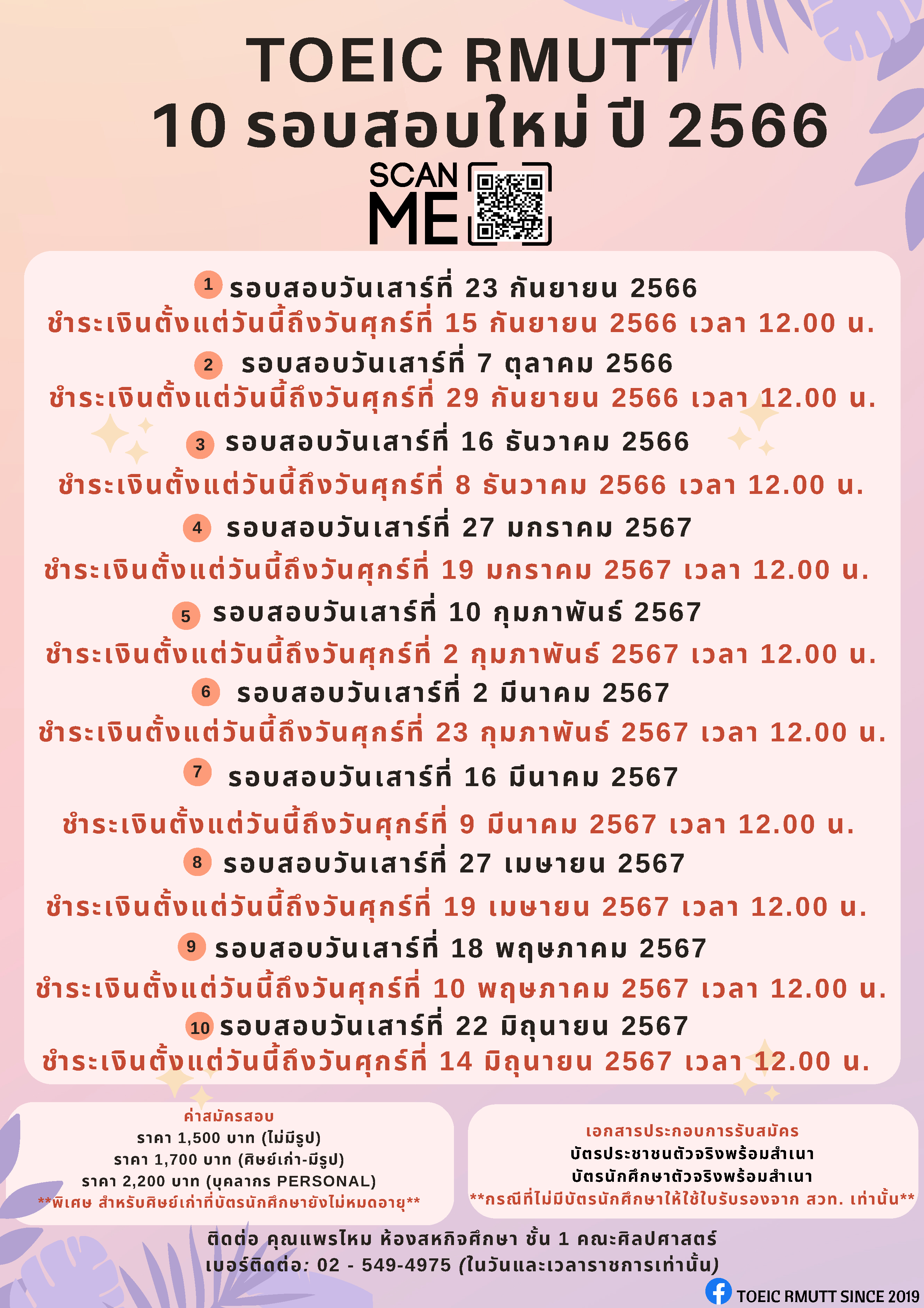 มทร.ธัญบุรี เปิดให้นักศึกษา บุคลากรและศิษย์เก่า สมัครสอบวัดระดับภาษาอังกฤษ TOEIC Posted by radio895 Last Updated: August 25, 2023 คณะศิลปะศาสตร์ มหาวิทยาลัยเทคโนโลยีราชมงคลธัญบุรี แจ้งกำหนดการเปิดสมัครสอบภาษาอังกฤษ TOEIC (TOEIC RMUTT) ปีการศึกษา 2566-2567 เพื่อให้นักศึกษาและบุคลากรของมหาวิทยาลัยฯ มีโอกาสทดสอบวัดระดับความสามรถการใช้ภาษาอังกฤษด้วยข้อสอบมาตรฐาน TOEIC เตรียมความพร้อมในการใช้ผลคะแนนภาษาอังกฤษยื่นขอสำเร็จการศึกษา การศึกษาต่อในระดับที่สูงขึ้น และสำหรับการทำงานในอนาคต โดยมีกำหนดการสอบ 10 รอบ ดังนี้ วันเสาร์ที่ 23 กันยายน 2566, วันเสาร์ที่ 7 ตุลาคม 2566, วันเสาร์ที่ 16 ธันวาคม 2566, วันเสาร์ที่ 27 มกราคม 2567, วันเสาร์ที่ 10 กุมภาพันธ์ 2567, วันเสาร์ที่ 2 มีนาคม 2567, วันเสาร์ที่ 16 มีนาคม 2567, วันเสาร์ที่ 27 เมษายน 2567, วันเสาร์ที่ 18 พฤษภาคม 2567 และวันเสาร์ที่ 22 มิถุนายน 2567 . โดยมีค่าสมัครสอบ 1,500 บาท ศิษย์เก่า มทร.ธัญบุรี 1,700 บาทและบุคลากร 2,200 บาท สอบถามข้อมูลเพิ่มเติมได้ที่ฝ่ายสหกิจศึกษา คณะศิลปศาสตร์ มทร.ธัญบุรี 0-2549-4975 ในวันและเวลาราชการ . เรียบเรียงโดย อาทิตยา ปักกะทานัง รายงานโดย ดาริสา ตระกูลเง็ก popular posts ราชมงคลธัญบุรี ชวนร่วมชมและเชียร์ทัพนักกีฬาในการแข่งขันกีฬามหาวิทยาลัยแห่งประเทศไทย ครั้งที่ 51 รอบคัดเลือก เขตภาคกลาง “ธัญบุรีเกมส์” 16 – 20 พ.ย.นี้ FIN TALK [EP.113] ชีวิตติดแอปฯ กับ Embedded Finance : ใช้จ่ายง่าย แต่หนี้ร้ายกว่าเดิม มทร.ธัญบุรี เตรียมจัดพิธีพระราชทานปริญญาบัตร ครั้งที่ 39 ประจำปีการศึกษา 2567 วันที่ 12 พ.ย.นี้ สถานีวิทยุราชมงคลธัญบุรี เปิดรับสมัคร เจ้าหน้าที่ประชาสัมพันธ์ radio895 August 25, 2023