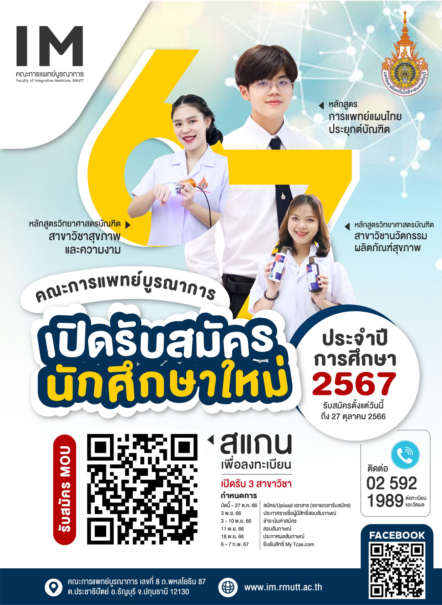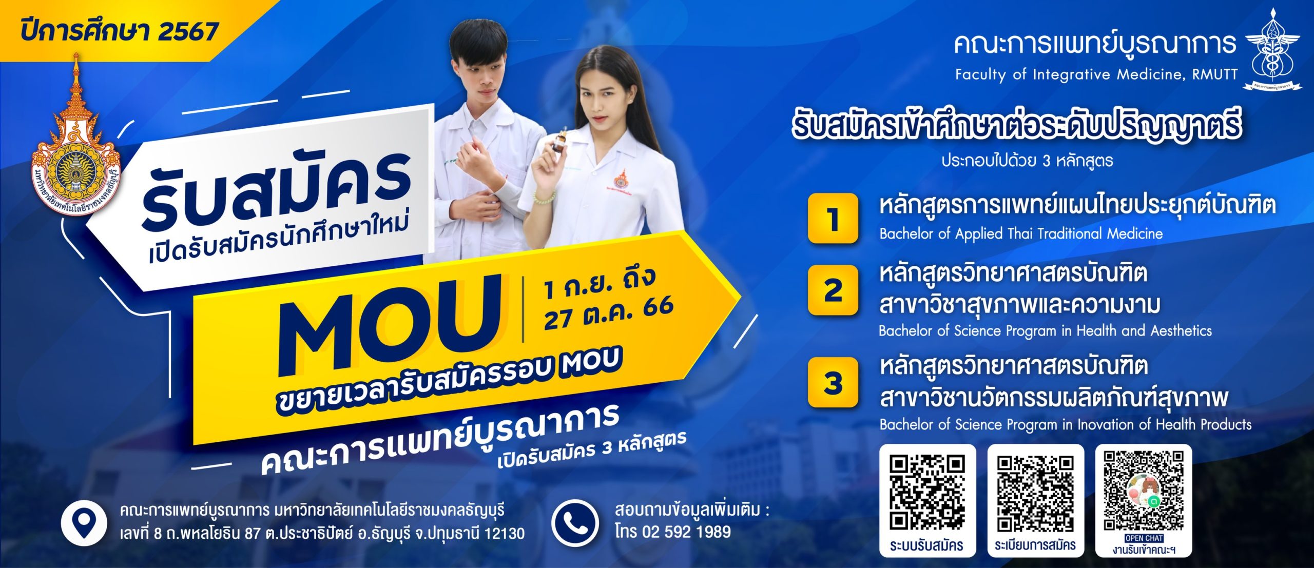 คณะการแพทย์บูรณาการ มทร.ธัญบุรี ขยายเวลารับสมัครนักศึกษาใหม่ระดับปริญญาตรี รอบ MOU ถึงวันที่ 27 ต.ค.นี้ Posted by radio895 Last Updated: October 20, 2023 คณะการแพทย์บูรณาการ มหาวิทยาลัยเทคโนโลยีราชมงคลธัญบุรี เปิดรับสมัครนักเรียนเข้าศึกษาต่อ ระดับปริญญาตรี ประจำปีการศึกษา 2567 รอบ MOU ขยายเวลารับสมัคร ถึงวันที่ 27 ตุลาคม 2566 โดยมีหลักสูตรที่เปิดรับสมัคร 3 หลักสูตร คือ 1. หลักสูตรการแพทย์แผนไทยประยุกต์บัณฑิต 2. หลักสูตรวิทยาศาสตรบัณฑิต สาขาวิชาสุขภาพและความงาม และ 3. หลักสูตรวิทยาศาสตรบัณฑิต สาขาวิชานวัตกรรมผลิตภัณฑ์สุขภาพ ติดต่อสอบถามเพิ่มเติมได้ที่ งานเทคโนโลยีการศึกษาและสารสนเทศ 0 2592 1989 . เรียบเรียงโดย อาทิตยา ปักกะทานัง รายงานโดย ดาริสา ตระกูลเง็ก popular posts ราชมงคลธัญบุรี ชวนร่วมชมและเชียร์ทัพนักกีฬาในการแข่งขันกีฬามหาวิทยาลัยแห่งประเทศไทย ครั้งที่ 51 รอบคัดเลือก เขตภาคกลาง “ธัญบุรีเกมส์” 16 – 20 พ.ย.นี้ สถานีวิทยุราชมงคลธัญบุรี เปิดรับสมัคร เจ้าหน้าที่ประชาสัมพันธ์ FIN TALK [EP.113] ชีวิตติดแอปฯ กับ Embedded Finance : ใช้จ่ายง่าย แต่หนี้ร้ายกว่าเดิม เพลินภาษานานาสาระ l ธรรมเนียมการฝังรก radio895 October 20, 2023