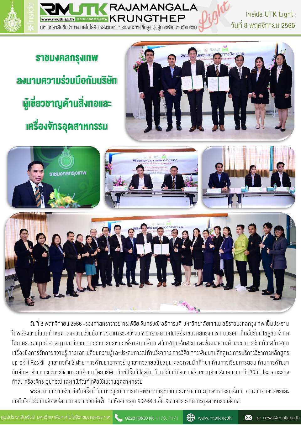 มหาวิทยาลัยเทคโนโลยีราชมงคลกรุงเทพ ลงนามความร่วมมือทางวิชาการร่วมกับ บริษัทเท็กซ์ปริ้นท์ โซลูชั่น จำกัด Posted by radio895 Last Updated: November 10, 2023 รศ.ดร.พิชัย จันทร์มณี อธิการบดี มหาวิทยาลัยเทคโนโลยีราชมงคลกรุงเทพ ร่วมลงนามความร่วมมือทางวิชาการกับ ดร.ธนฤทธิ์ สกุลญานนท์วิทยา กรรมการบริหาร บริษัทเท็กซ์ปริ้นท์ โซลูชั่น จำกัด ณ ห้องประชุมคณะอุตสาหกรรมสิ่งทอ มหาวิทยาลัยเทคโนโลยีราชมงคลกรุงเทพ ภายใต้วัตถุประสงค์ในการแลกเปลี่ยน สนับสนุน และส่งเสริมงานวิชาการและงานวิจัย ของคณะอุตสาหกรรมสิ่งทอ และคณะวิทยาศาสตร์และเทคโนโลยี เพื่อการพัฒนาหลักสูตรการเรียนการสอนการบริการวิชาการ ตลอดจนการพัฒนาศักยภาพบุคลากรทั้งสองฝ่ายร่วมกัน . ฐิติรัตน์ แสงบุญเกิด มหาวิทยาลัยเทคโนโลยีราชมงคลกรุงเทพ รายงาน popular posts ราชมงคลธัญบุรี ชวนร่วมชมและเชียร์ทัพนักกีฬาในการแข่งขันกีฬามหาวิทยาลัยแห่งประเทศไทย ครั้งที่ 51 รอบคัดเลือก เขตภาคกลาง “ธัญบุรีเกมส์” 16 – 20 พ.ย.นี้ สถานีวิทยุราชมงคลธัญบุรี เปิดรับสมัคร เจ้าหน้าที่ประชาสัมพันธ์ FIN TALK [EP.113] ชีวิตติดแอปฯ กับ Embedded Finance : ใช้จ่ายง่าย แต่หนี้ร้ายกว่าเดิม เพลินภาษานานาสาระ l ธรรมเนียมการฝังรก radio895 November 10, 2023