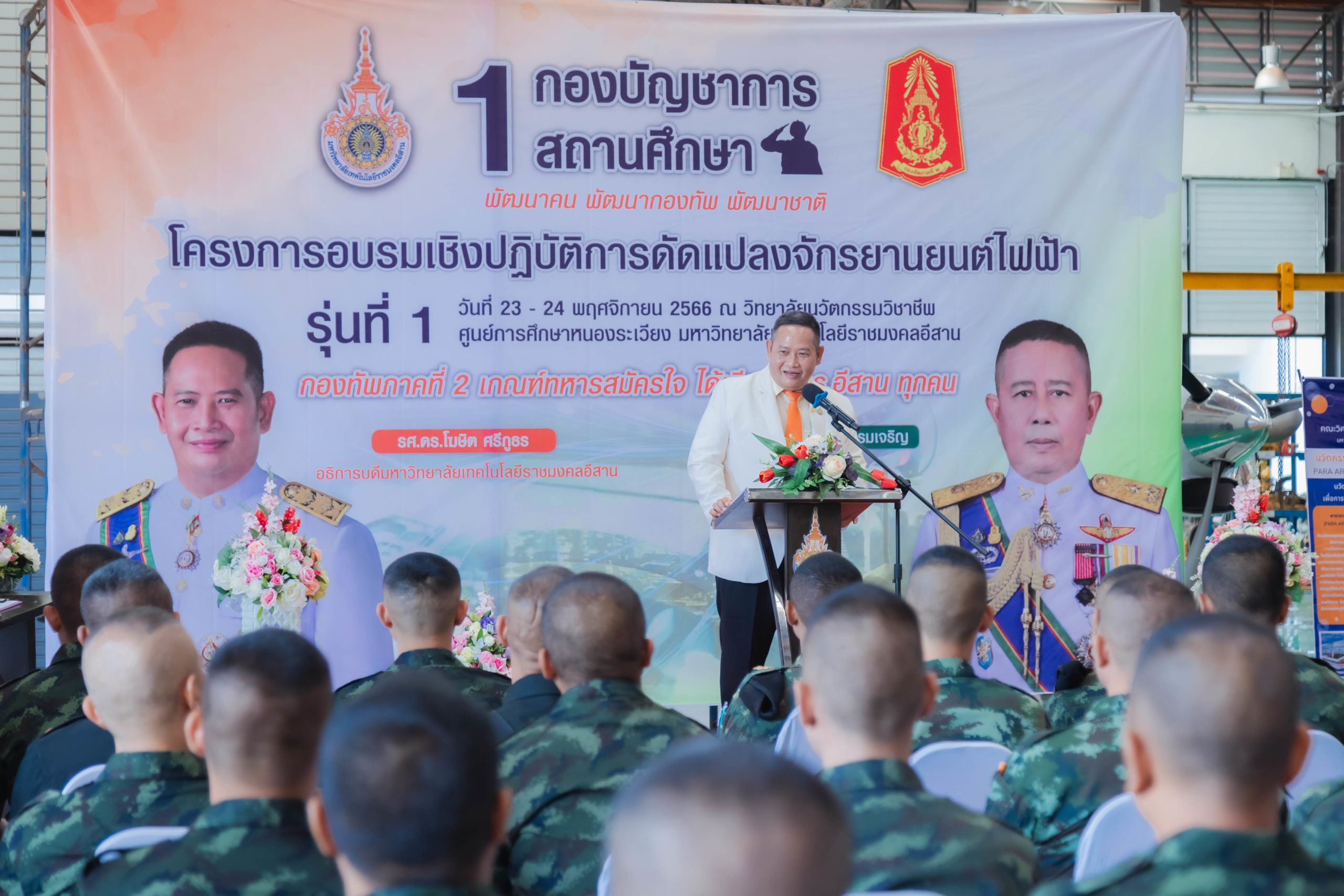 ด้าน รองศาสตราจารย์ ดร.โฆษิต ศรีภูธร อธิการบดี มทร.อีสาน เปิดเผยว่า โครงการนี้ เป็นผลสืบเนื่องมาจากการที่ มหาวิทยาลัยได้มีการลงนามบันทึกข้อตกลงความร่วมมือทางวิชาการ ระหว่าง กองทัพบก โดย กองทัพภาคที่ 2 กับ มหาวิทยาลัยเทคโนโลยีราชมงคลอีสาน โดยมีวัตถุประสงค์เพื่อร่วมกันในการพัฒนาศักยภาพกำลังพล และประชาชนภาคอีสาน ให้เป็นกำลังแรงงานคุณภาพสูง โดยการจัดทำหลักสูตรระยะสั้น ระยะกลาง และระยะยาว ผ่านการบริการด้านวิชาการทั้ง Up Skills /Re Skills /New Skills ตลอดจนการนำศักยภาพของแต่ละฝ่าย มาหนุนเสริมซึ่งกันและกันในทุกมิติ และในการจัดโครงการนี้ ถือเป็นอีก 1 หลักสูตร ที่ มทร.อีสาน ได้จัดขึ้นเพื่อร่วมถ่ายทอดองค์ความรู้แก่กำลังพลทหาร เพราะผู้เข้าร่วมการอบรมซึ่งเป็นกำลังพลทหารที่ได้รับการตรวจเลือกทหารกองเกิน จะสามารถนำไปพัฒนาเป็นอาชีพ สร้างรายได้ อีกทั้งสามารถต่อยอดสู่เชิงพาณิชย์ ช่วยให้เศรษฐกิจเจริญเติบโต อย่างมีเสถียรภาพ และกระจายรายได้สู่สังคมต่อไปได้เป็นอย่างดี อีกทั้งยังสามารถเก็บสะสมหน่วยกิตเพื่อสะสมขอรับคุณวุฒิและปริญญาจาก มทร.อีสาน ได้ด้วย ซึ่งในอนาคตทั้ง 2 หน่วยงานได้มีการวางแผนร่วมกันเพื่อออกแบบหลักสูตรให้ทหารสามารถเรียนระหว่างการเป็นทหารเพื่อเพิ่มสมรรถนะวิชาชีพและคุณวุฒิการศึกษาได้อย่างไร้รอยต่อ
