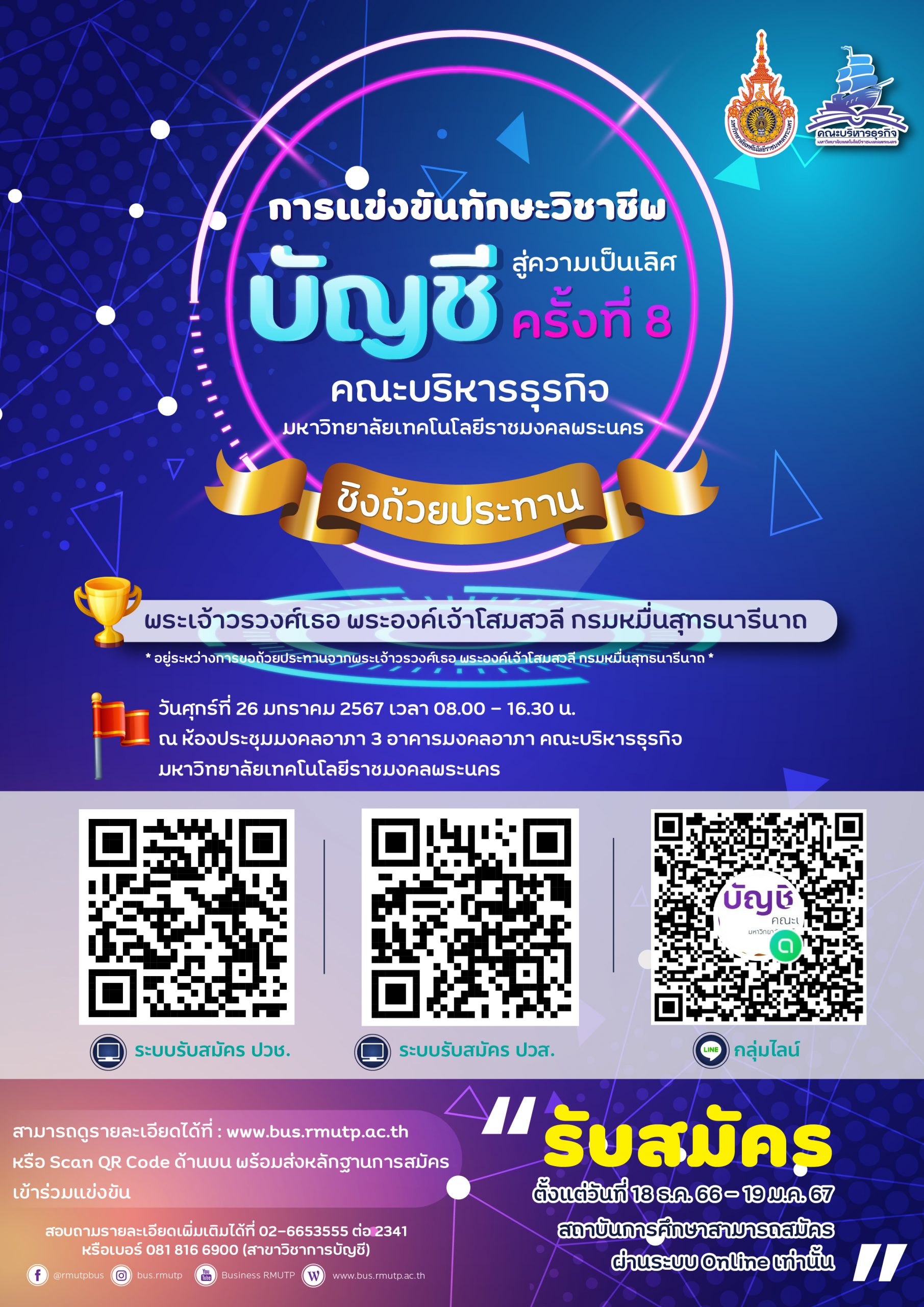 ผู้สนใจสมัครผ่านระบบออนไลน์ได้ตั้งแต่วันนี้ – วันที่ 19 มกราคม 2567สมัครเข้าร่วมการแข่งขัน ระดับประกาศนียบัตรวิชาชีพ (ปวช.) : https://shorturl.asia/cwKqb สมัครเข้าร่วมการแข่งขัน ระดับประกาศนียบัตรวิชาชีพชั้นสูง (ปวส.) : https://shorturl.asia/Y1JCx สอบถามข้อมูลเพิ่มเติมได้ที่สาขาวิชาการบัญชี โทร 02-6653555 ต่อ 2341