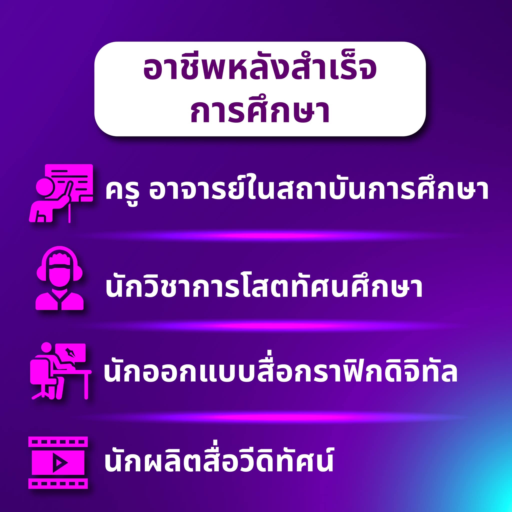 สำหรับหลักสูตรศึกษาศาสตรบัณฑิต สาขาวิชาเทคโนโลยีและสื่อสารการศึกษา เป็นหลักสูตรที่มุ่งเน้นผลิตครูมืออาชีพด้านเทคโนโลยีการศึกษา สร้างนวัตกรและสร้างสรรค์นวัตกรรม ร่วมพัฒนาความรู้ด้านวิชาชีพครู ส่งเสริมทักษะทางสมรรถนะวิชาชีพ ออกแบบ สร้างสรรค์และถ่ายทอดนวัตกรรมทางเทคโนโลยีและสื่อสารการศึกษา โดยผู้สำเร็จการศึกษาสามารถประกอบอาชีพ อาทิ ครู อาจารย์ และบุคลากรทางการศึกษา ในโรงเรียน / สถาบันอาชีวศึกษา / มหาวิทยาลัย / การศึกษานอกระบบ นักออกแบบสื่อกราฟฟิกดิจิทัลนักผลิตสื่อวีดิทัศน์ และอาชีพอื่นๆ ด้านเทคโนโลยี
