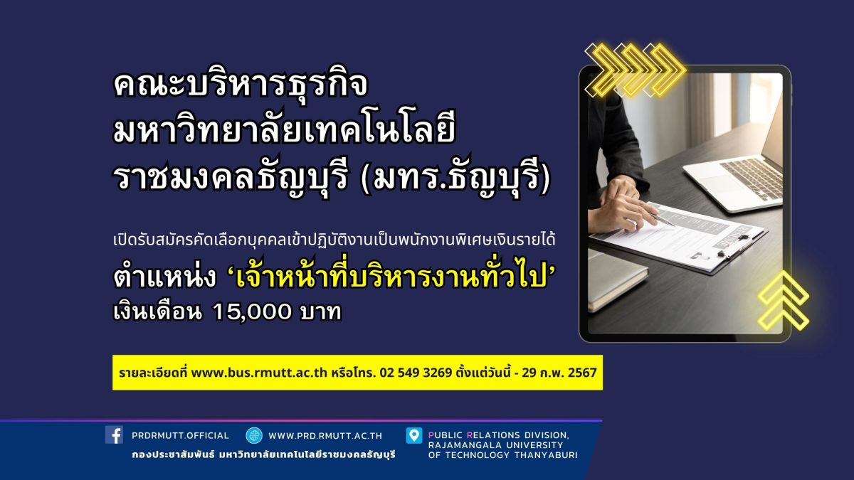 คณะบริหารธุรกิจ มทร.ธัญบุรี เปิดรับสมัครบุคคลเข้าปฏิบัติงานเป็นพนักงานพิเศษเงินรายได้ ตำแหน่งเจ้าหน้าที่บริหารงานทั่วไป จำนวน 1 อัตรา Posted by radio895 Last Updated: February 24, 2024 คณะบริหารธุรกิจ มหาวิทยาลัยเทคโนโลยีราชมงคลธัญบุรี แจ้งเปิดรับสมัครบุคคลเข้าปฏิบัติงานเป็นพนักงานพิเศษเงินรายได้ จำนวน 1 อัตรา ตำแหน่งเจ้าหน้าที่บริหารงานทั่วไป อัตราค่าจ้าง 15,000 บาท คุณสมบัติผู้สมัคร อายุมากกว่า 18 ปี แต่ไม่เกิน 60 ปี สำเร็จการศึกษาระดับปริญญาตรี สาขาบริหารธุรกิจหรือสาขาที่เกี่ยวข้อง หากเป็นเพศชาย ต้องผ่านการเกณฑ์ทหารแล้ว . ผู้ที่สนใจสามารถเดินทางยื่นใบสมัครด้วยตนเองได้ที่งานบุคลากร อาคาร 4 ชั้น 1 คณะบริหารธุรกิจ มทร.ธัญบุรี จ.ปทุมธานี ตั้งแต่บัดนี้ถึงวันที่ 29 ก.พ.2567 สอบถามข้อมูลได้ที่ 0-2549-3269 . เรียบเรียงโดย อาทิตยา ปักกะทานัง รายงานโดย ดาริสา ยิ้มสิงห์ popular posts OVERTECH – ตามทันโลกไอที [EP.05] ความแตกต่างระหว่าง RTX และ GTX มทร.ล้านนา เดินหน้าต่อยอด MOU รุ่ยเจี๋ย ไทยแลนด์ สร้างโอกาสใหม่ เตรียมปั้นนักศึกษา – บุคลากร สู่มืออาชีพด้านเครือข่าย มทร.ธัญบุรี ชวนเที่ยวงานสืบสานประเพณีลอยกระทง 2568 สำนักจัดการทรัพย์สิน มทร.ธัญบุรี ขอเชิญชวนเที่ยวงาน “สืบสานประเพณีลอยกระทง”ประจำปี 2568 วันที่ 1 – 6 พฤศจิกายน 2568 radio895 February 24, 2024
