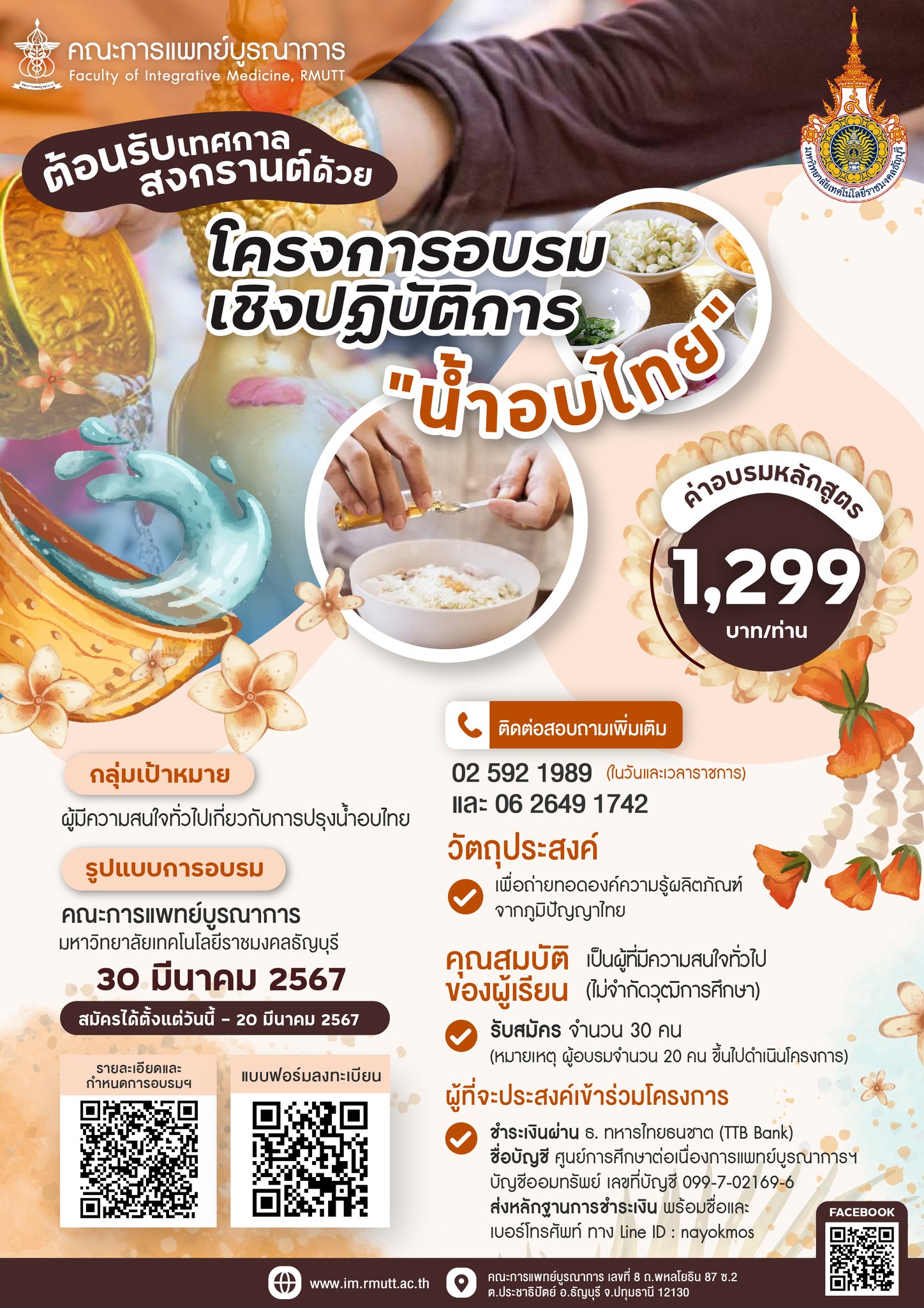 เปิดอบรมวันที่ 30 มีนาคม 2567 ณ คณะการแพทย์บูรณาการ มหาวิทยาลัยเทคโนโลยีราชมงคลธัญบุรี ศูนย์รังสิต รับจำนวนจำกัด 30 ท่านเท่านั้น