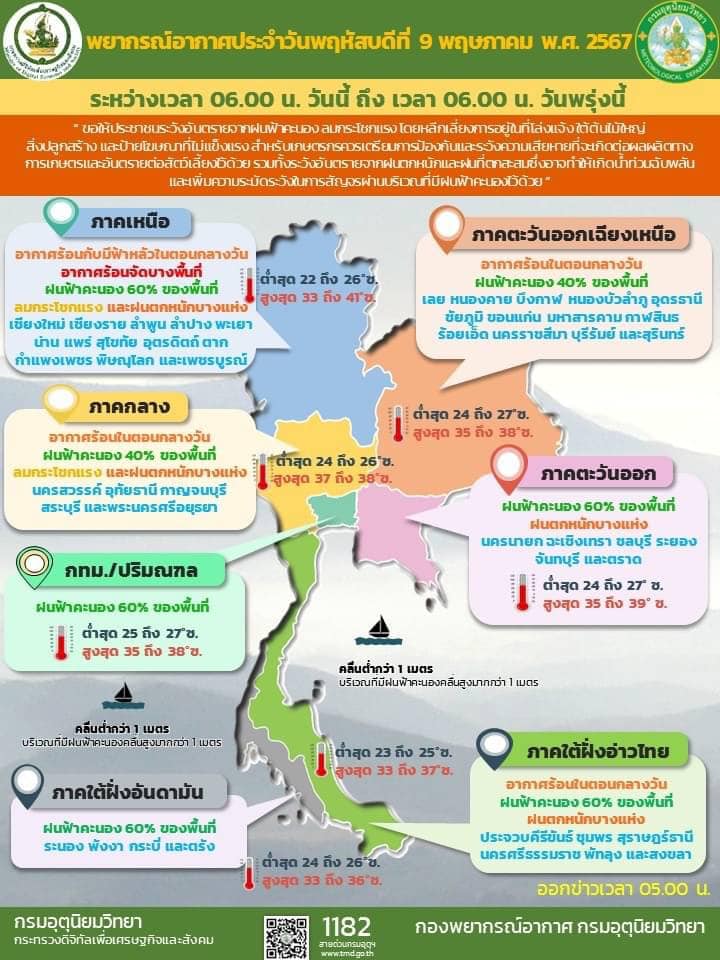 09.00 ประเทศไทยตอนบนมีฝนฟ้าคะนอง ลมกระโชกแรง กรุงเทพปริมณฑล ฝนร้อยละ 60