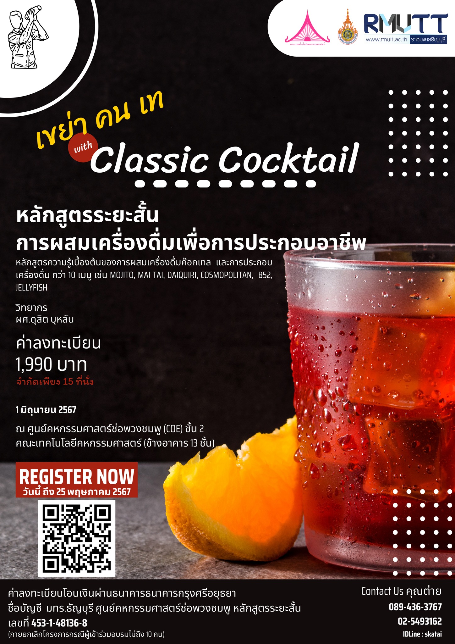 คณะเทคโนโลยีคหกรรมศาสตร์ มทร.ธัญบุรี ชวนผู้ที่สนใจเข้าร่วมอบรมหลักสูตรระยะสั้น การผสมเครื่องดื่ม เพื่อการประกอบอาชีพ Posted by radio895 Last Updated: May 10, 2024 คณะเทคโนโลยีคหกรรมศาสตร์ มหาวิทยาลัยเทคโนโลยีราชมงคลธัญบุรี (มทร.ธัญบุรี) ชวนผู้ที่สนใจเข้าร่วมอบรมหลักสูตรระยะสั้น การผสมเครื่องดื่ม เพื่อการประกอบอาชีพ โดยวิทยากร ผศ.ดุสิต บุหลัน วันที่ 1 มิถุนายน 2567 เวลา 9.00-16.00 น. ณ ศูนย์คหกรรมศาสตร์ช่อพวงชมพู (COE) ชั้น 2 คณะเทคโนโลยีคหกรรมศาสตร์ มทร.ธัญบุรี จ.ปทุมธานี มีอัตราค่าลงทะเบียน 1,990 บาท โดยผู้เข้าร่วมอบรมจะได้รับความรู้เบื้องต้นเกี่ยวกับเครื่องดื่มค๊อกเทล ทั้งประวัติความเป็นมา อุปกรณ์และเครืองมือ ประเภทของเครื่องดื่ม และได้เรียนรู้ปฏิบัติการประกอบเครื่องดื่มเบื้องต้น เช่น Mojito, Mai tai, Daiquiri, Cosmopolitan, Tequila sunrise, Black Russian, B52, Jellyfish on Fire . ผู้ที่สนใจสอบถามรายละเอียดเพิ่มเติมได้ที่ 089-496-3767 , 0-2549-3162 หรือ ID Line : skatai . เรียบเรียงโดย อาทิตยา ปักกะทานัง รายงานโดย ดาริสา ยิ้มสิงห์ popular posts ราชมงคลธัญบุรี ชวนร่วมชมและเชียร์ทัพนักกีฬาในการแข่งขันกีฬามหาวิทยาลัยแห่งประเทศไทย ครั้งที่ 51 รอบคัดเลือก เขตภาคกลาง “ธัญบุรีเกมส์” 16 – 20 พ.ย.นี้ FIN TALK [EP.113] ชีวิตติดแอปฯ กับ Embedded Finance : ใช้จ่ายง่าย แต่หนี้ร้ายกว่าเดิม มทร.ธัญบุรี เตรียมจัดพิธีพระราชทานปริญญาบัตร ครั้งที่ 39 ประจำปีการศึกษา 2567 วันที่ 12 พ.ย.นี้ สถานีวิทยุราชมงคลธัญบุรี เปิดรับสมัคร เจ้าหน้าที่ประชาสัมพันธ์ radio895 May 10, 2024