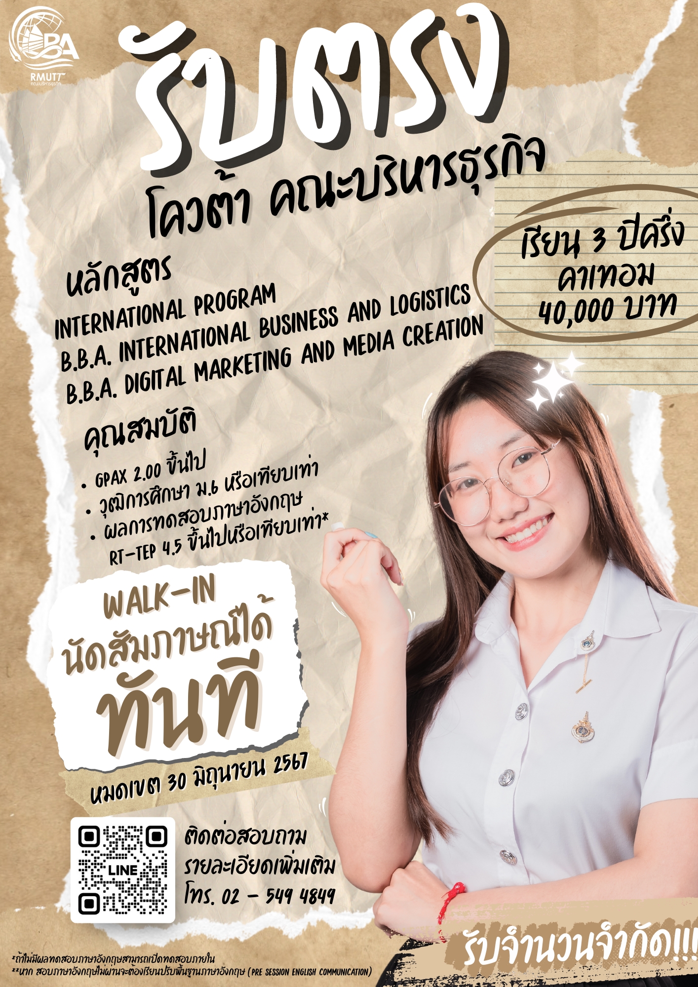 คุณสมบัติผู้สมัคร จบวุฒิการศึกษา ม.6 หรือเทียบเท่า ผลการสอบภาษาอังกฤษ RT-TEP 4.5 ขึ้นไปหรือเทียบเท่า ทั้ง 2 หลักสูตรเรียน 3 ปีครึ่ง ค่าเทอม 40,000 บาท รับสมัครตั้งแต่วันนี้ถึง 30 มิถุนายน 2567 สอบถามข้อมูลและการสมัครได้ที่ 0-2549-4849 และ www.bus.rmutt.ac.th