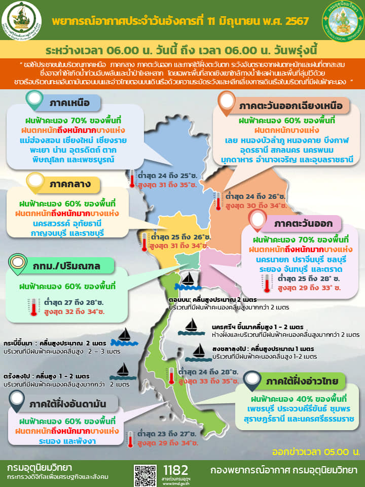 09.00 ฝนตกทั่วไทย ตกหนักบางพื้นที่ เตือนระวัง น้ำท่วมฉับพลันและน้ำป่าไหลหลาก กรุงเทพฯ และปริมณฑล มีฝน ร้อยละ 60 ของพื้นที่