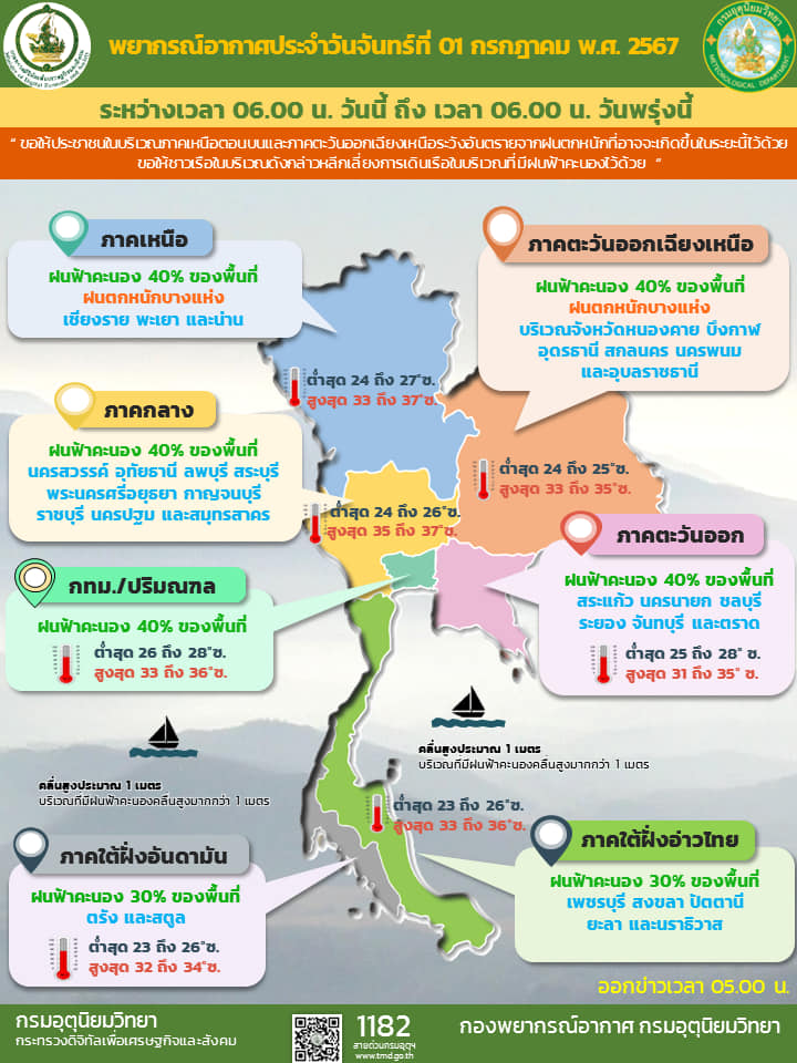 09.00 กรมอุตุฯ เตือน ภาคเหนือ – อีสาน ระวังอันตรายจากฝนตกหนัก กรุงเทพปริมณฑลฝนร้อยละ 40 ของพื้นที่ ส่วนทะเลคลื่นสูง 1 เมตร