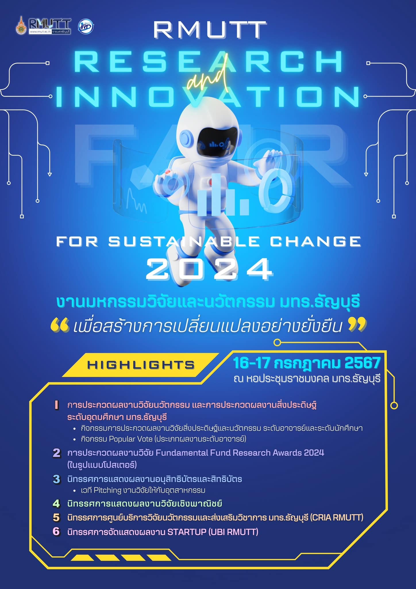 โดยมีกิจกรรมภายในงาน ได้แก่ การประกวดผลงานวิจัยนวัตกรรมและการประกวดผลงานสิ่งประดิษฐ์ระดับอุดมศึกษา มทร.ธัญบุรี, การประกวดผลงานวิจัย Fundamental Fund Research Awards 2024 (ในรูปแบบโปสเตอร์), นิทรรศการจัดแสดงผลงานอนุสิทธิบัตรและสิทธิบัตร พร้อมเวที Pitching งานวิจัยให้กับภาคอุตสาหกรรม, นิทรรศการแสดงผลงานวิจัยเชิงพาณิชย์ ภายในโซน ยังมีแหล่งทุนเพื่อต่อยอดเชิงพาณิชย์, ผลงานวิจัยจากชุมชนและภาคอุตสาหกรรมและผลงานที่ได้รับรางวัลจากการประกวดในระดับนานาชาติ, นิทรรศการศูนย์บริการวิจัยนวัตกรรมและส่งเสริมวิชาการ มทร.ธัญบุรี (CRIA RMUTT) จัดแสดงผลงานเด่นที่ศูนย์ได้ให้บริการ พร้อมจัดกิจกรรมแจก Gift Voucher และนิทรรศการจัดแสดงผลงาน Start Up (UBI RMUTT)