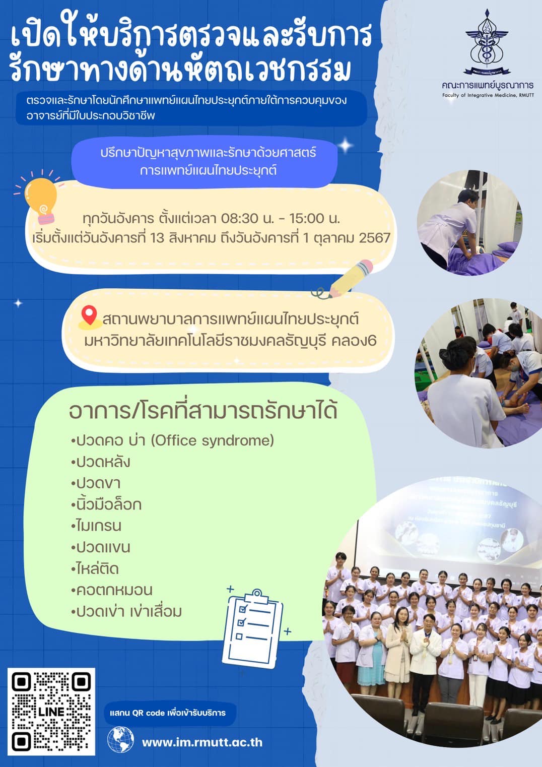 ผู้ที่สนใจสามารถปรึกษาปัญหาสุขภาพและการรักษาด้วยศาสตร์การแพทย์แผนไทยประยุกต์ได้ฟรี ไม่มีค่าใช้จ่าย ทุกวันอังคาร เวลา 08.30 – 15.00 น. ตั้งแต่บัดนี้ – วันอังคารที่ 1 ตุลาคม 2567 ณ สถานพยาบาลการแพทย์แผนไทยประยุกต์ มหาวิทยาลัยเทคโนโลยีราชมงคลธัญบุรี คลองหก จังหวัดปทุมธานี เข้าดูรายละเอียดและสอบถามข้อมูลเพิ่มเติมได้ที่ www.im.rmutt.ac.th และ Facebook: คณะการแพทย์บูรณาการ มทร.ธัญบุรี