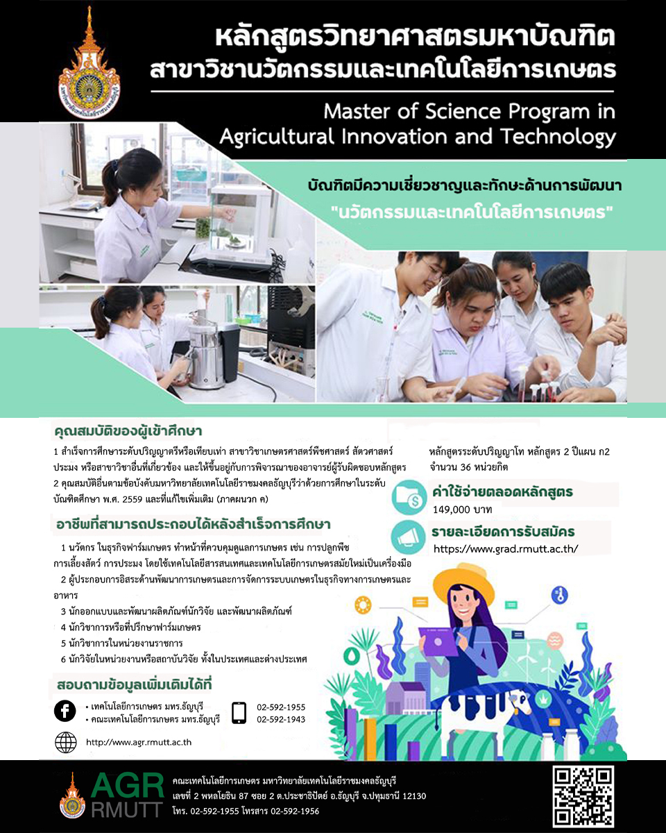 โดยมีค่าใช้จ่ายตลอดหลักสูตร 149,000 บาท ผู้ที่สนใจสอบถามข้อมูลเพิ่มเติมได้ที่ คณะเทคโนโลยีการเกษตร มทร.ธัญบุรี www.agr.rmutt.ac.th หรือที่ 0-2592-1955