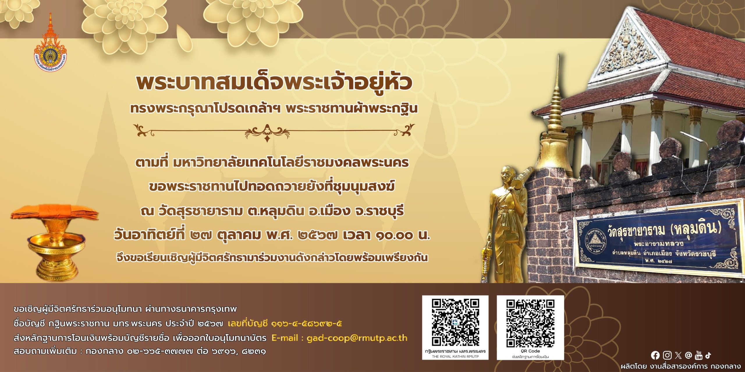 มหาวิทยาลัยเทคโนโลยีราชมงคลพระนคร ขอเชิญชวนผู้มีจิตศรัทธาร่วมทำบุญกฐินพระราชทาน ปี 2567 Posted by radio895 Last Updated: September 18, 2024 มหาวิทยาลัยเทคโนโลยีราชมงคลพระนคร กำหนดนำผ้าพระกฐินพระราชทาน ประจำปี 2567 ถวายพระภิกษุสามเณรที่จำพรรษา ณ วัดสุรชายาราม ต.หลุมดิน อ.เมือง จ.ราชบุรี ในวันอาทิตย์ที่ 27 ตุลาคม 2567 เวลา 10.00 น. จึงเชิญชวนผู้มีจิตศรัทธาร่วมทำบุญสมทบในการถวายผ้ากฐินพระราชทาน เพื่อสืบทอดประเพณีในพระพุทธศาสนา และร่วมกันทำนุบำรุงปฏิสังขรณ์พระอารามหลวงให้มีความสง่างามเจริญรุ่งเรืองถาวรสืบไป โดยสามารถทำบุญโดย โอนเงินเข้าบัญชีธนาคารกรุงเทพ จำกัด (มหาชน) ชื่อบัญชี “กฐินพระราชทาน มทร.พระนคร ประจำปี2567” เลขที่บัญชี 116-4-58692-5 และส่งหลักฐานการโอนเงินพร้อมกับรายชื่อผู้ร่วมอนุโมทนาบุญ ที่กองกลาง ราชมงคลพระนคร เพื่อออกใบอนุโมทนาบัตรต่อไป . ทั้งนี้ สอบถามเพิ่มเติมได้ที่ กองกลาง ราชมงคลพระนคร โทร 02 665 3777 ต่อ 6916 , 8231 . นันทนา สีมา สื่อสารองค์การราชมงคลพระนคร รายงาน popular posts ราชมงคลธัญบุรี ชวนร่วมชมและเชียร์ทัพนักกีฬาในการแข่งขันกีฬามหาวิทยาลัยแห่งประเทศไทย ครั้งที่ 51 รอบคัดเลือก เขตภาคกลาง “ธัญบุรีเกมส์” 16 – 20 พ.ย.นี้ FIN TALK [EP.113] ชีวิตติดแอปฯ กับ Embedded Finance : ใช้จ่ายง่าย แต่หนี้ร้ายกว่าเดิม สถานีวิทยุราชมงคลธัญบุรี เปิดรับสมัคร เจ้าหน้าที่ประชาสัมพันธ์ เพลินภาษานานาสาระ l ธรรมเนียมการฝังรก radio895 September 18, 2024