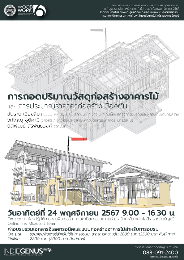 ผู้ที่สนใจเข้าร่วมอบรมหลักสูตรการถอดปริมาณวัสดุก่อสร้างอาคารไม้และการประมาณราคาค่าก่อสร้างเบื้องต้น สามารถติดต่อได้ที่ คุณชลากร พูนสิน โทรศัพท์ 083-091-2400