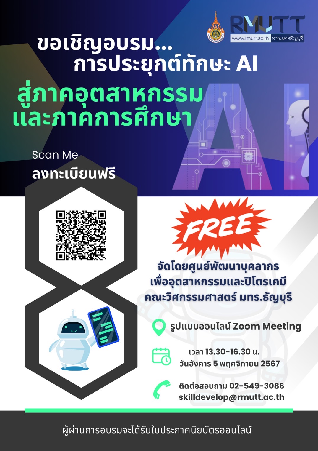 และ 3.การประยุกต์ทักษะ AI สร้างสรรค์ (Generative AI) สําหรับภาคการศึกษา โดยวิทยากร ผศ.ดร.อภิชาติ สนธิสมบัติ ผู้อํานวยการสํานักความร่วมมืออุตสาหกรรม มทร.ธัญบุรี และผู้อํานวยการศูนย์พัฒนาบุคลากรเพื่ออุตสาหกรรมและปิโตรเคมี คณะวิศวกรรมศาสตร์ มทร.ธัญบุรี