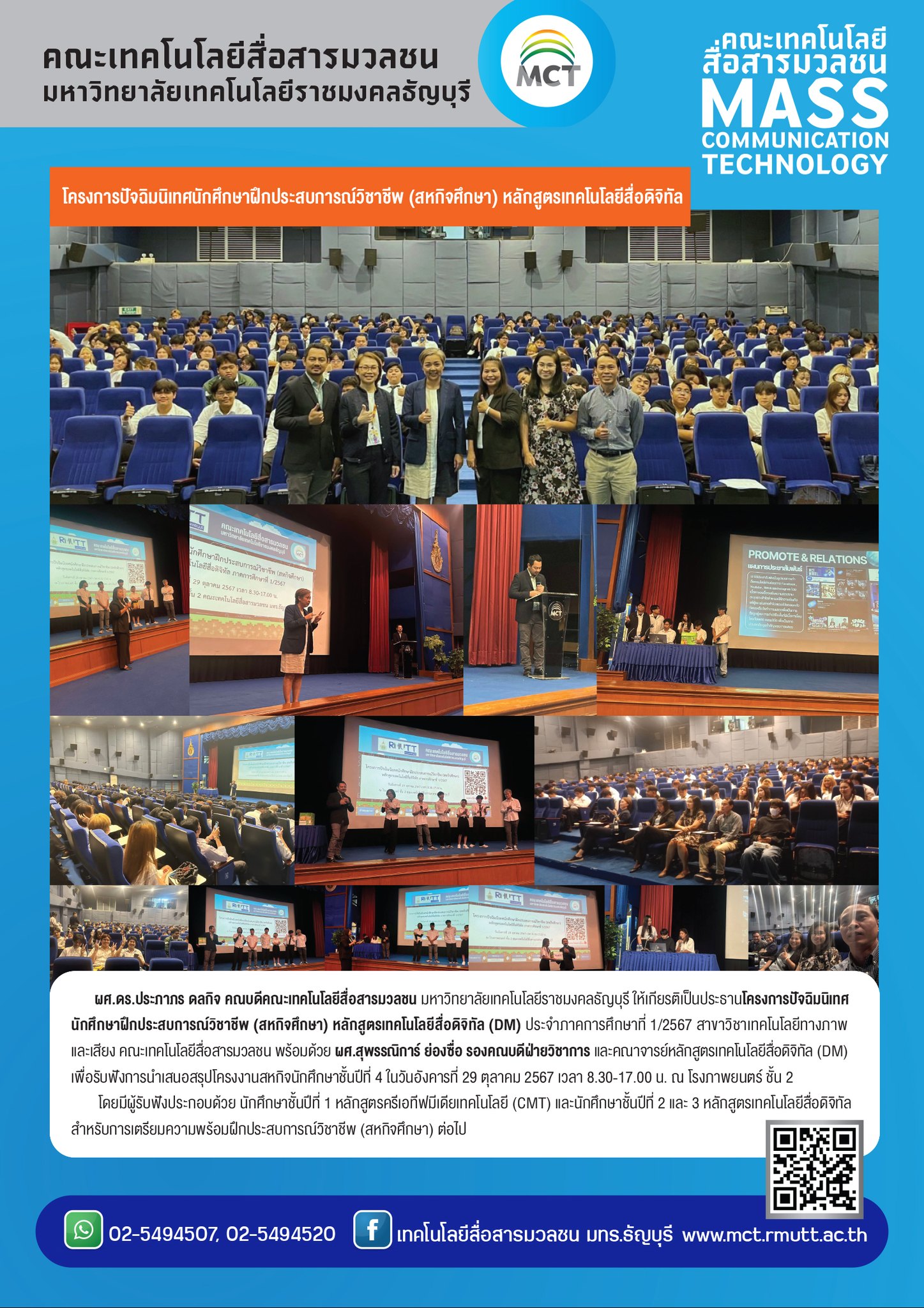 ทั้งนี้ ยังได้เปิดโอกาสให้นักศึกษาชั้นปีที่ 1 หลักสูตรครีเอทีฟมีเดียเทคโนโลยี (CMT) นักศึกษาชั้นปีที่ 2 และ 3 หลักสูตรเทคโนโลยีสื่อดิจิทัล เข้าร่วมรับฟังการนำเสนอด้วย เพื่อเตรียมความพร้อมในการฝึกประสบการณ์วิชาชีพ (สหกิจศึกษา) ของตนเองต่อไป