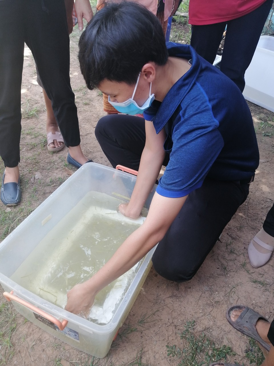 ส่วน ผศ.วินัย เล่ากระบวนการผลิตกระทงลอยอีเอ็มบอล วิธีการทำ เริ่มจากตัดกระดาษแข็งขนาดเส้นผ่าศูนย์กลาง 6 นิ้ว จากนั้นตัดกระดาษฟางข้าวผสม EM ball กว้าง 2 นิ้ว ยาว 4 นิ้ว จำนวน 24 กลีบ พันเป็นกลีบสัตตบุษย์ มัดฟางข้าวให้เป็นวงกลมเส้นผ่าศูนย์กลาง 4 นิ้ว ติดกลีบสัตบุษย์ ลงบนกระดาษแข็งเป็นรูปบัวคว่ำ ตัดกระดาษขนาด 2 นิ้ว X 2 นิ้ว พับกลีบเล็บมือนางติดลงบนกลีบบัวคว่ำ ติดกลีบสัตตบุษย์ สับหว่างกลีบเป็นรูปบัวหงาย ตกแต่งด้วยธูป – เทียน และตุ๊กตากระดาษฟางข้าว