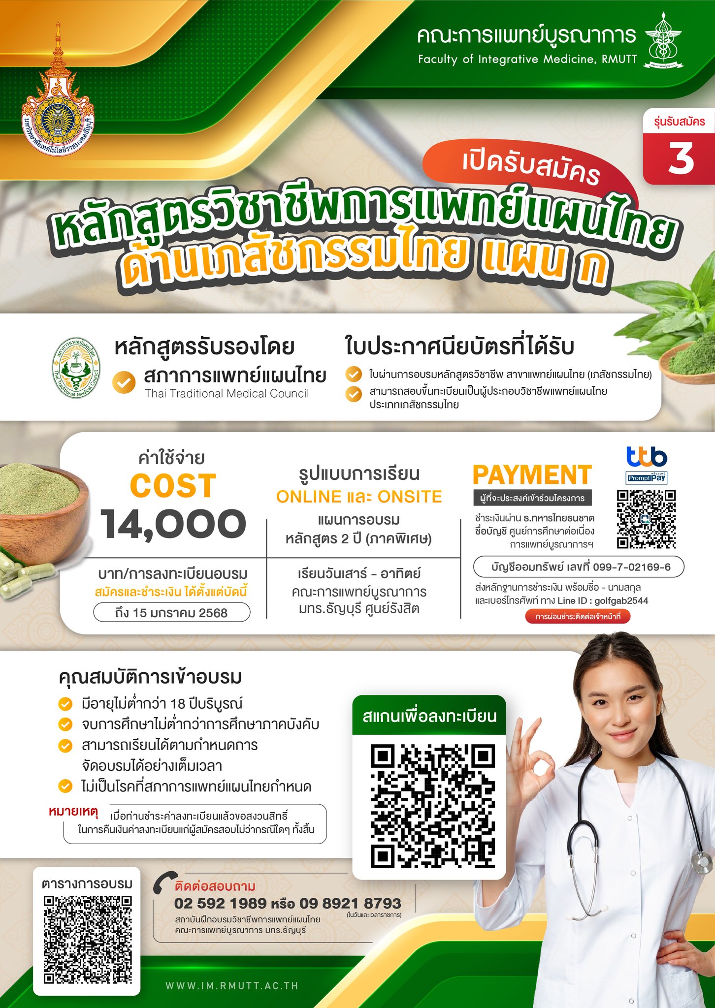 คุณสมบัติผู้สมัคร เป็นบุคคลอายุไม่ต่ำกว่า 18 ปีบริบูรณ์ จบการศึกษาไม่ต่ำกว่าการศึกษาภาคบังคับ สามารถเรียนได้ตามกำหนดการจัดอบรมเต็มเวลา ไม่เป็นโรคที่สภาการแพทย์แผนไทยกำหนด รูปแบบเรียนการสอนทั้ง Online และ Onsite ณ คณะการแพทย์บูรณาการ มทร.ธัญบุรี ศูนย์รังสิต เปิดภาคการศึกษาวันที่ 18 มกราคม 2568 ค่าลงทะเบียนเรียน 14,000 บาทต่อเทอม ผู้ที่สนใจสอบถามข้อมูลได้ที่ 0 2592 1989 หรือ 098 921 8793 ในวันและเวลาราชการ