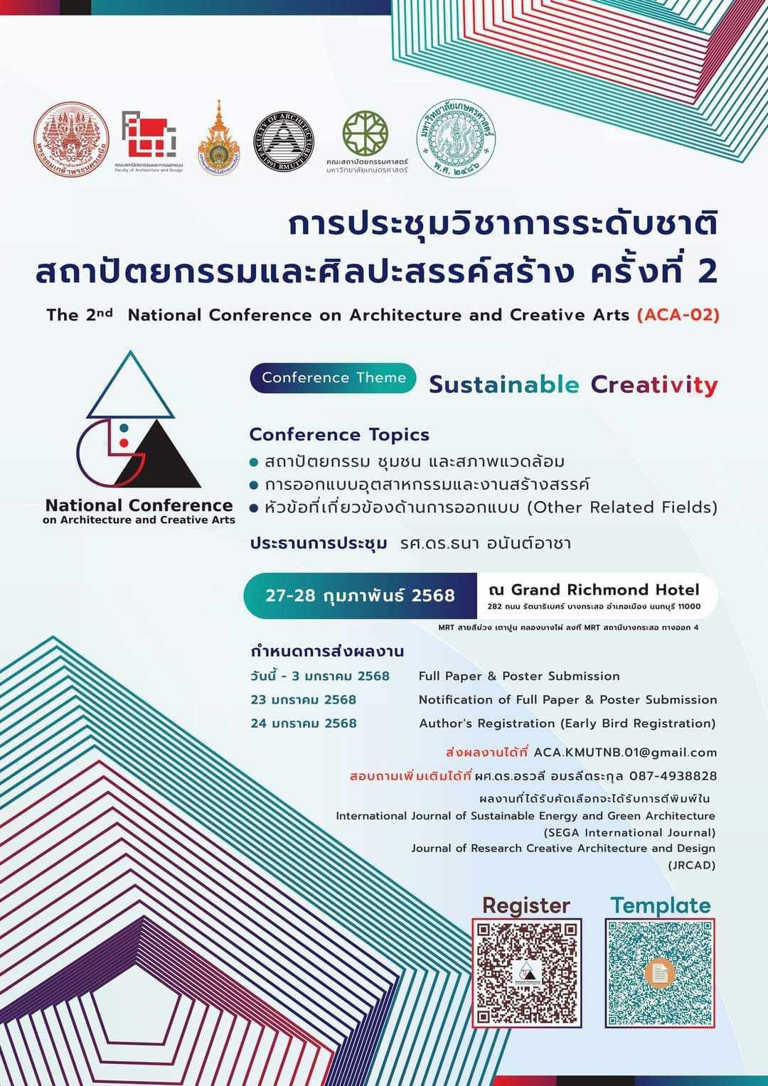 โดยกำหนดแนวคิด Sustainable Creativity ในหัวข้อ สถาปัตยกรรม ชุมชนและสภาพแวดล้อม, การออกแบบอุตสาหกรรมและงานสร้างสรรค์ และหัวข้อที่เกี่ยวข้องด้านการออกแบบ (Other Related Fields) กำหนดการส่งผลงานตั้งแต่วันนี้ ถึง 3 มกราคม 2568 ผลงานที่ได้รับการคัดเลือกจะได้รับการตีพิมพ์ในวารสาร International Journal of Sustainable Energy and Green Architecture ZSEGA International Journal) และ Journal of Research Creative Architecture and Design (JRCAD)