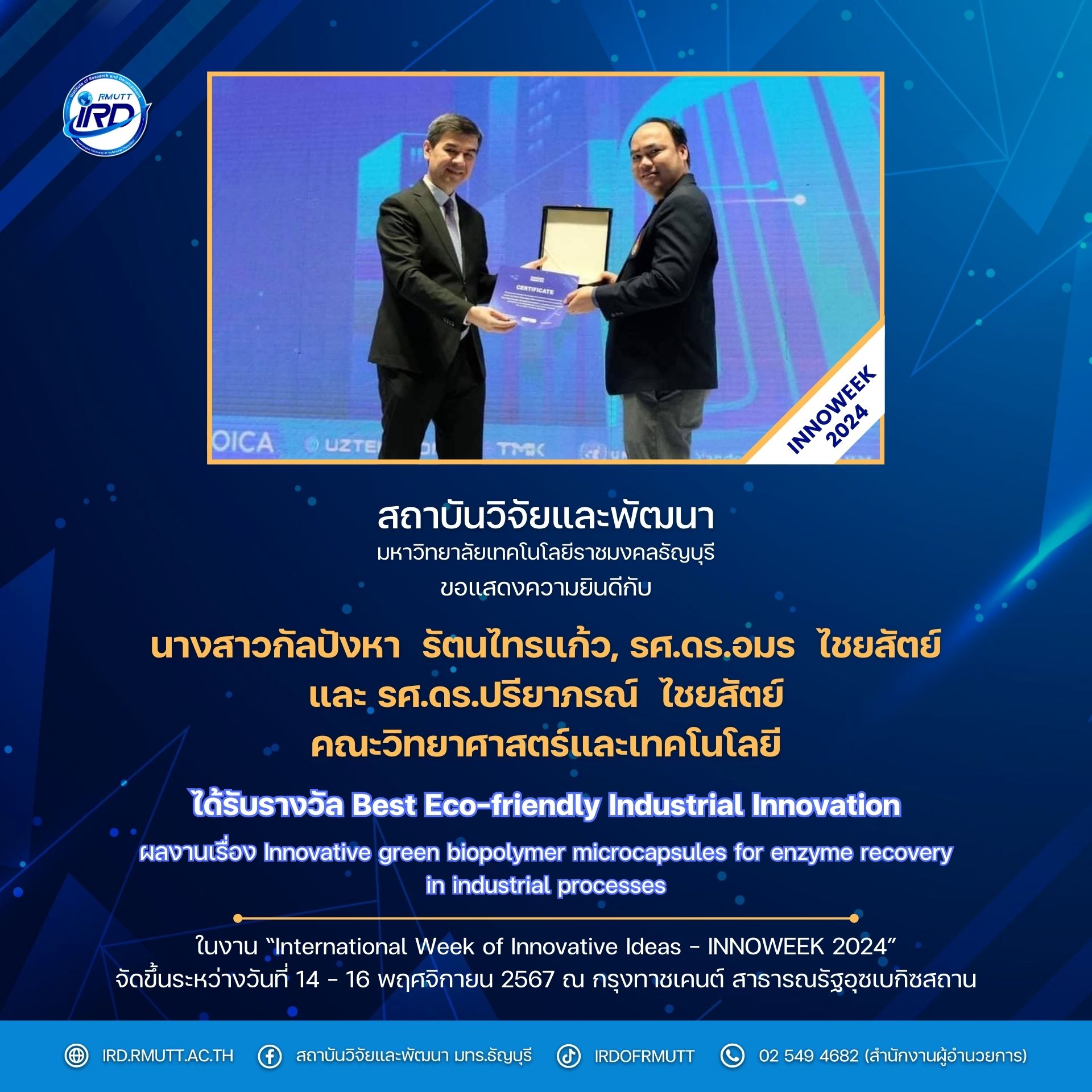 (3) รางวัล Best Eco-friendly Industrial Innovation ผลงาน “Innovative green biopolymer microcapsules for enzyme recovery in industrial processes” โดย น.ส.กัลปังหา รัตนไทรแก้ว, รศ.ดร.อมร ไชยสัตย์ และรศ.ดร.ปรียาภรณ์ ไชยสัตย์ (คณะวิทยาศาสตร์และเทคโนโลยี)
