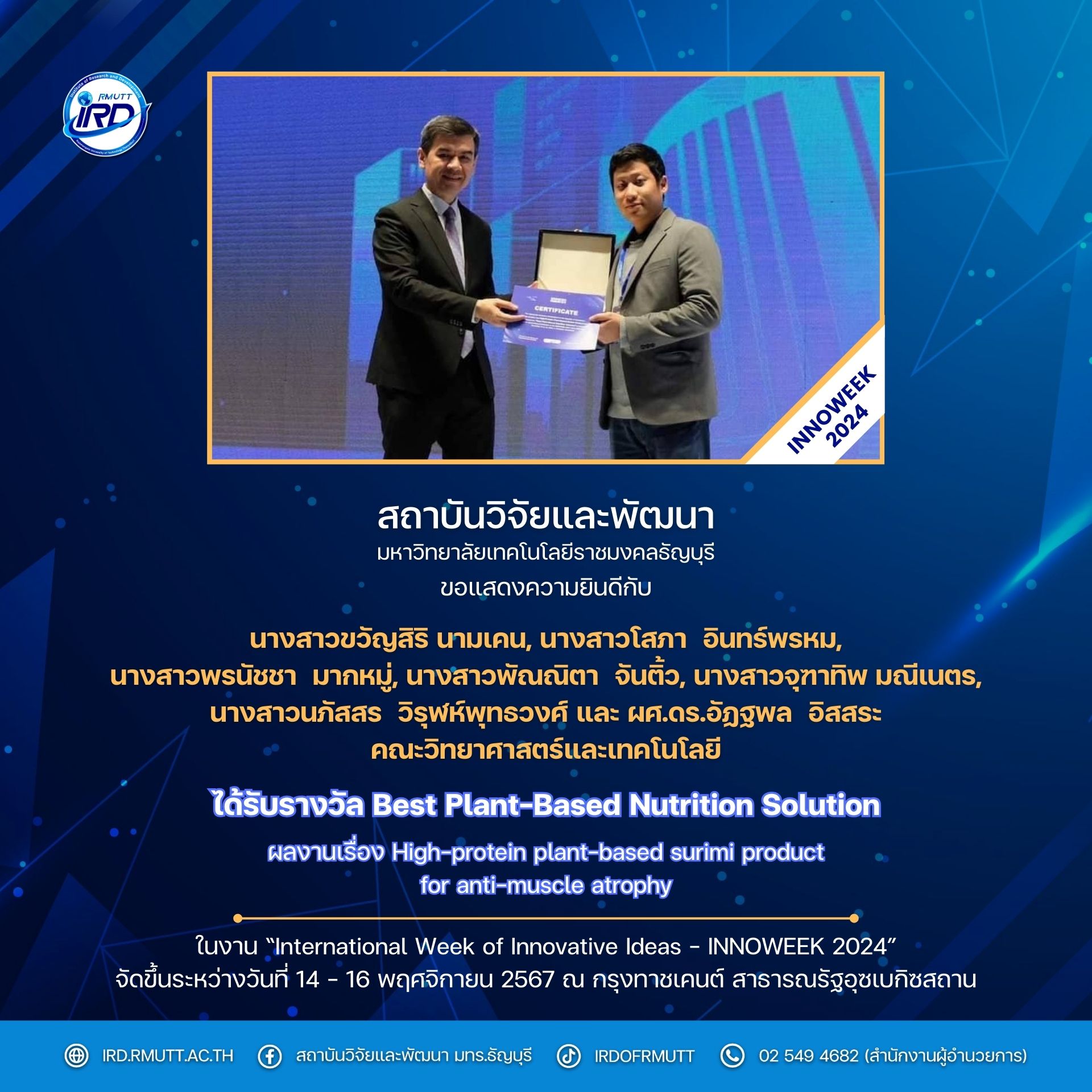 (4) รางวัล Best Plant-Based Nutrition Solution ผลงาน “High-protein plant-based surimi product for anti-muscle atrophy” โดย น.ส.ขวัญสิริ นามเคน, น.ส.โสภา อินทร์พรหม, น.ส.พรนัชชา มากหมู่, น.ส.พัณณิตา จันติ้ว, น.ส.จุฑาทิพ มณีเนตร, น.ส.นภัสสร วิรุฬห์พุทธวงศ์ และผศ.ดร.อัฏฐพล อิสสระ (คณะวิทยาศาสตร์และเทคโนโลยี)