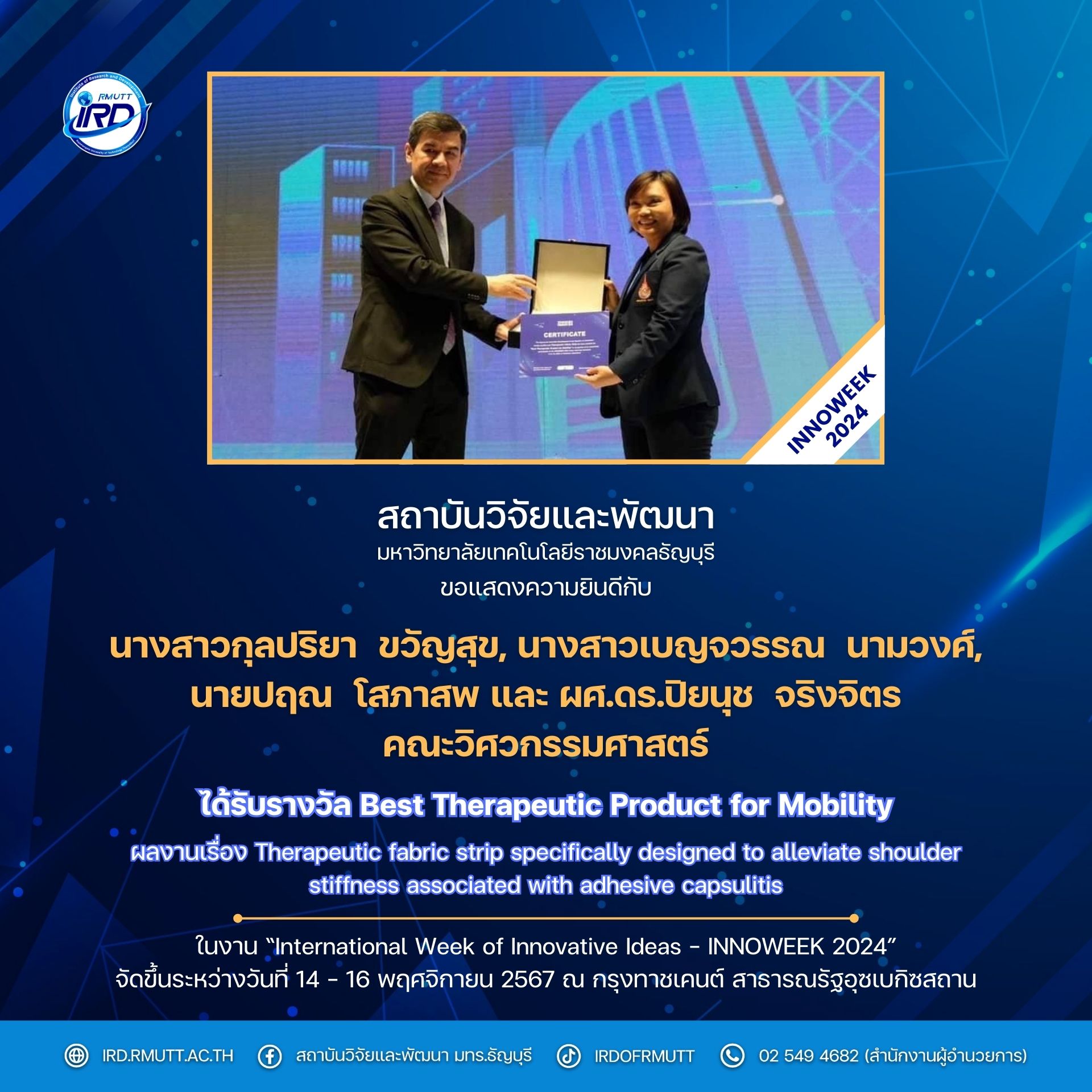 (2) รางวัล Best Therapeutic Product for Mobility ผลงาน “Therapeutic fabric strip specifically designed to alleviate shoulder stiffness associated with adhesive capsulitis” โดย น.ส.กุลปริยา ขวัญสุข, น.ส.เบญจวรรณ นามวงศ์, นายปฤณ โสภาสพ และผศ.ดร.ปิยนุช จริงจิตร (คณะวิศวกรรมศาสตร์)