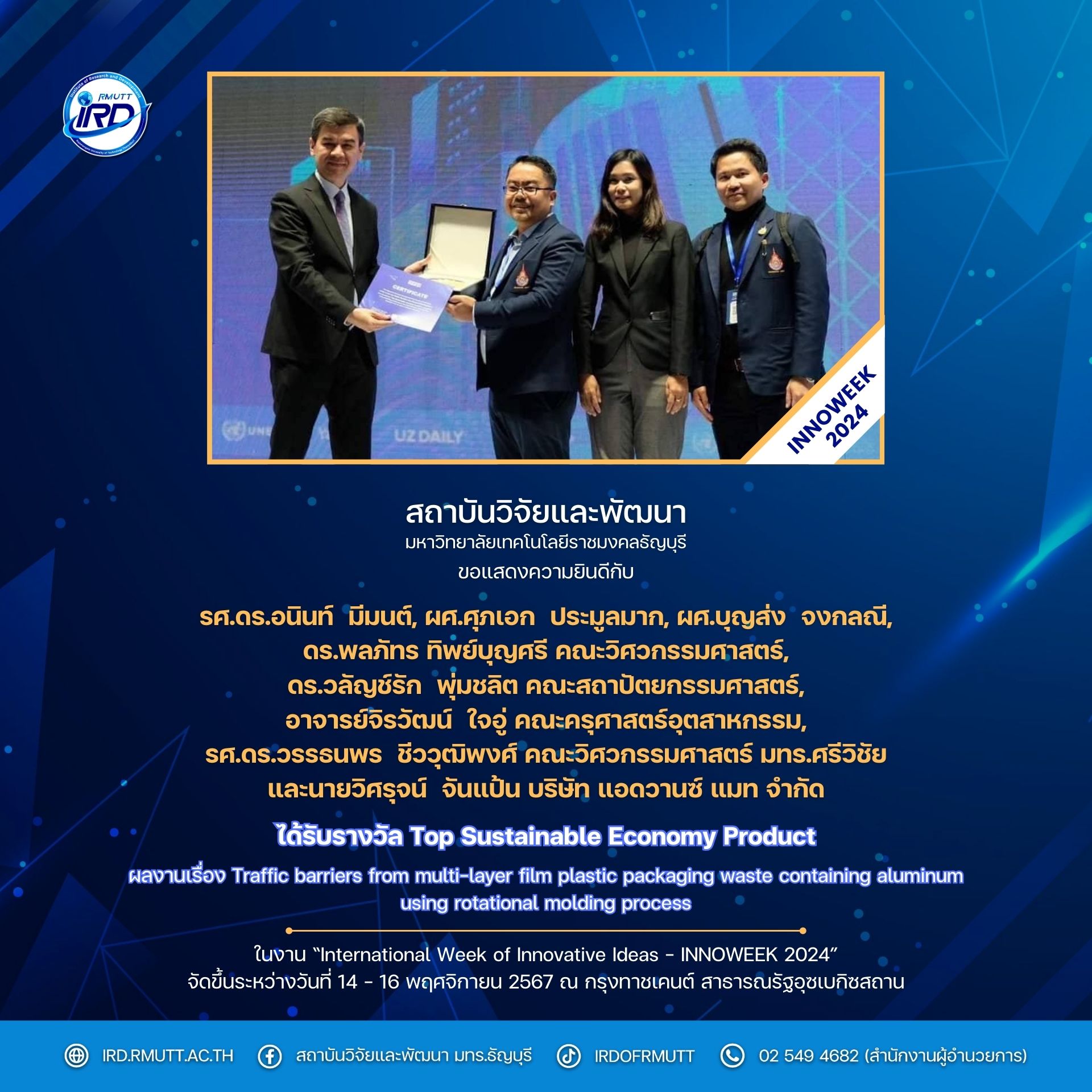 (1) รางวัล Top Sustainable Economy Product ผลงาน “Traffic barriers from multi-layer film plastic packaging waste containing aluminum using rotational molding process” โดย รศ.ดร.อนินท์ มีมนต์, ผศ.ศุภเอก ประมูลมาก, ผศ.บุญส่ง จงกลณี, ดร.พลภัทร ทิพย์บุญศรี (คณะวิศวกรรมศาสตร์), ดร.วลัญช์รัก พุ่มชลิต (คณะสถาปัตยกรรมศาสตร์), อ.จิรวัฒน์ ใจอู่ (คณะครุศาสตร์อุตสาหกรรม), รศ.ดร.วรรธนพร ชีววุฒิพงศ์ (คณะวิศวกรรมศาสตร์ มทร.ศรีวิชัย) และนายวิศรุจน์ จันแป้น (บริษัท แอดวานซ์ แมท จำกัด)
