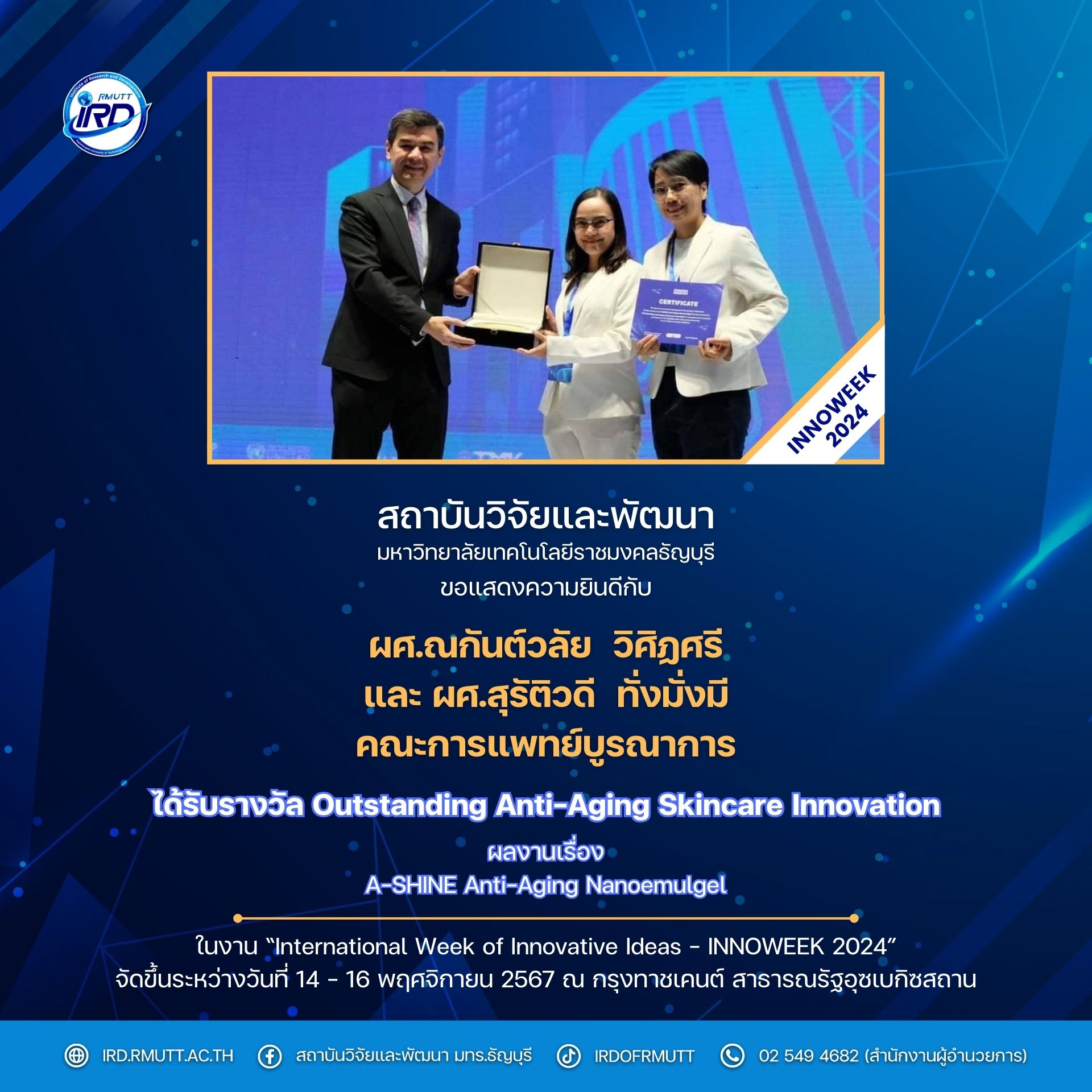 และ (5) รางวัล Outstanding Anti-Aging Skincare Innovation ผลงาน “A-SHINE Anti-Aging Nanoemulgel” โดย ผศ.ณกันต์วลัย วิศิฏศรี และผศ.สุรัติวดี ทั่งมั่งมี (คณะการแพทย์บูรณาการ)