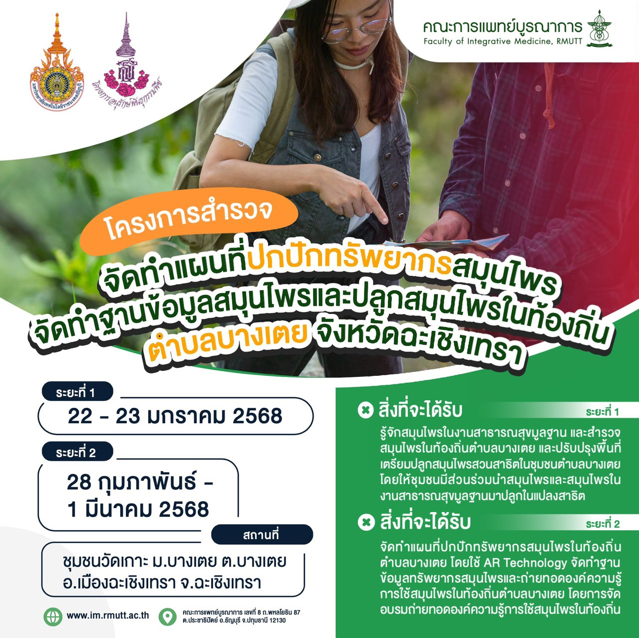 สิ่งที่จะได้รับ ระยะที่ 2 จัดทําแผนที่ปกปักทรัพยากรสมุนไพรในท้องถิ่น ตําบลบางเตย โดยใช้ AR Technology จัดทําฐานข้อมูลทรัพยากรสมุนไพรและถ่ายทอดองค์ความรู้การใช้สมุนไพรในท้องถิ่นตําบลบางเตย โดยการจัดอบรมถ่ายทอดองค์ความรู้การใช้สมุนไพรในท้องถิ่น