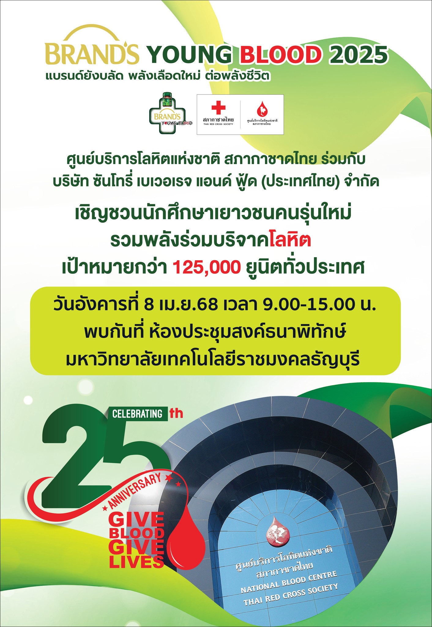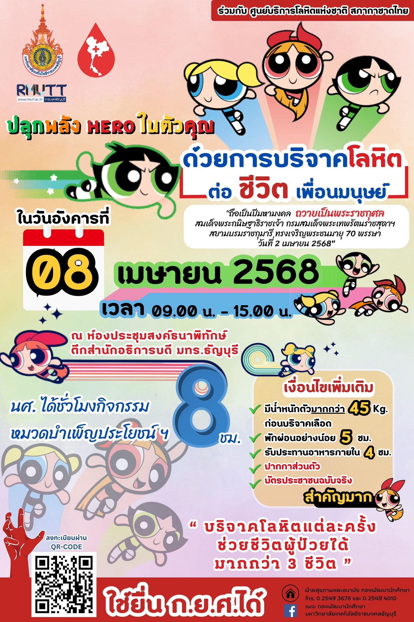 ขอเชิญชวนนักศึกษา เยาวชนคนรุ่นใหม่ บุคลากร รวมทั้งประชาชนที่สนใจ รวมพลังร่วมบริจาคโลหิต โดยมีเป้าหมายกว่า 125,000 ยูนิตทั่วประเทศ ในวันอังคารที่ 8 เมษายน 2568 ระหว่างเวลา 09.00 – 15.00 น. ณ ห้องประชุมสงค์ธนาพิทักษ์ ตึกสำนักอธิการบดี มทร.ธัญบุรี จ.ปทุมธานี