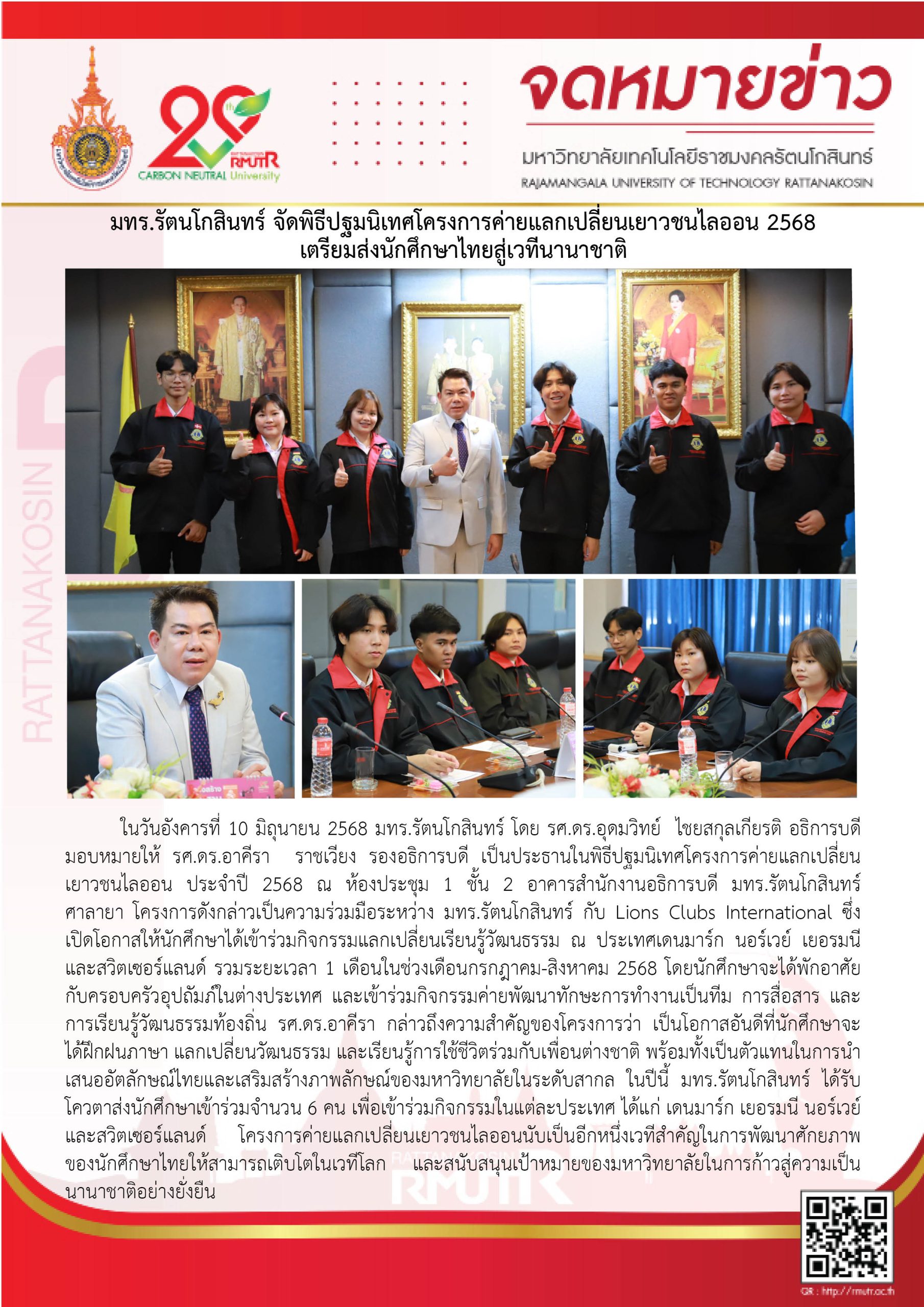 รศ.ดร.อาคีรา กล่าวถึงความสำคัญของโครงการว่า เป็นโอกาสอันดีที่นักศึกษาจะได้ฝึกฝนภาษา แลกเปลี่ยนวัฒนธรรม และเรียนรู้การใช้ชีวิตร่วมกับเพื่อนต่างชาติ พร้อมทั้งเป็นตัวแทนในการนำเสนออัตลักษณ์ไทยและเสริมสร้างภาพลักษณ์ของมหาวิทยาลัยในระดับสากล ในปีนี้ มทร.รัตนโกสินทร์ ได้รับโควตาส่งนักศึกษาเข้าร่วมจำนวน 6 คน เพื่อเข้าร่วมกิจกรรมในแต่ละประเทศ ได้แก่ เดนมาร์ก เยอรมนี นอร์เวย์ และสวิตเซอร์แลนด์ โครงการค่ายแลกเปลี่ยนเยาวชนไลออนนับเป็นอีกหนึ่งเวทีสำคัญในการพัฒนาศักยภาพของนักศึกษาไทยให้สามารถเติบโตในเวทีโลก และสนับสนุนเป้าหมายของมหาวิทยาลัยในการก้าวสู่ความเป็นนานาชาติอย่างยั่งยืน