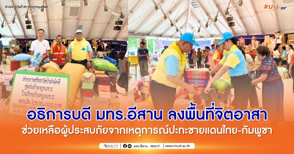 โดยเมื่อวันที่ 27 กรกฎาคม 2568 รองศาสตราจารย์ ดร.โฆษิต ศรีภูธร อธิการบดี มทร.อีสาน ลงพื้นที่ปฏิบัติงานจิตอาสาเพื่อให้ความช่วยเหลือและบรรเทาความเดือดร้อนแก่ประชาชนที่ได้รับผลกระทบจากเหตุการณ์ปะทะตามแนวชายแดนไทย – กัมพูชา จังหวัดสุรินทร์ ในการนี้ อธิการบดีได้ร่วมมอบสิ่งของจำเป็น อาทิ อาหารแห้ง น้ำดื่ม เวชภัณฑ์เบื้องต้น และเครื่องใช้ในชีวิตประจำวัน พร้อมทั้งให้กำลังใจแก่ผู้ประสบภัยและเจ้าหน้าที่จิตอาสาที่ร่วมดูแลศูนย์พักพิงอย่างใกล้ชิด