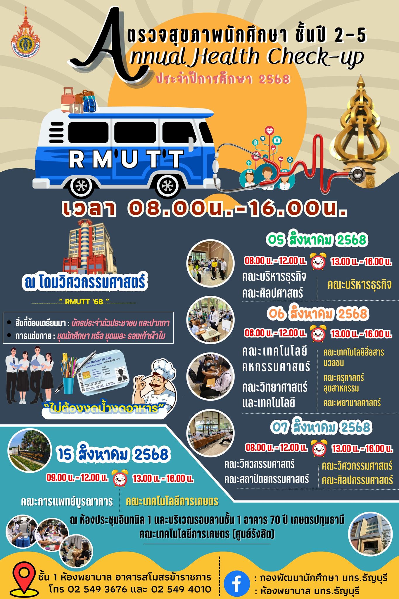 นักศึกษาที่จะเข้ารับการตรวจสุขภาพ ไม่ต้องงดน้ำงดอาหาร แต่งกายด้วยชุดนักศึกษา ชุดพละ หรือชุดสุภาพ รองเท้าผ้าใบ นำบัตรประจำตัวประชาชน และปากกามาด้วย เข้าดูรายละเอียดกำหนดการและสอบถามเพิ่มเติมได้ที่ Facebook กองพัฒนานักศึกษา มหาวิทยาลัยเทคโนโลยีราชมงคลธัญบุรี