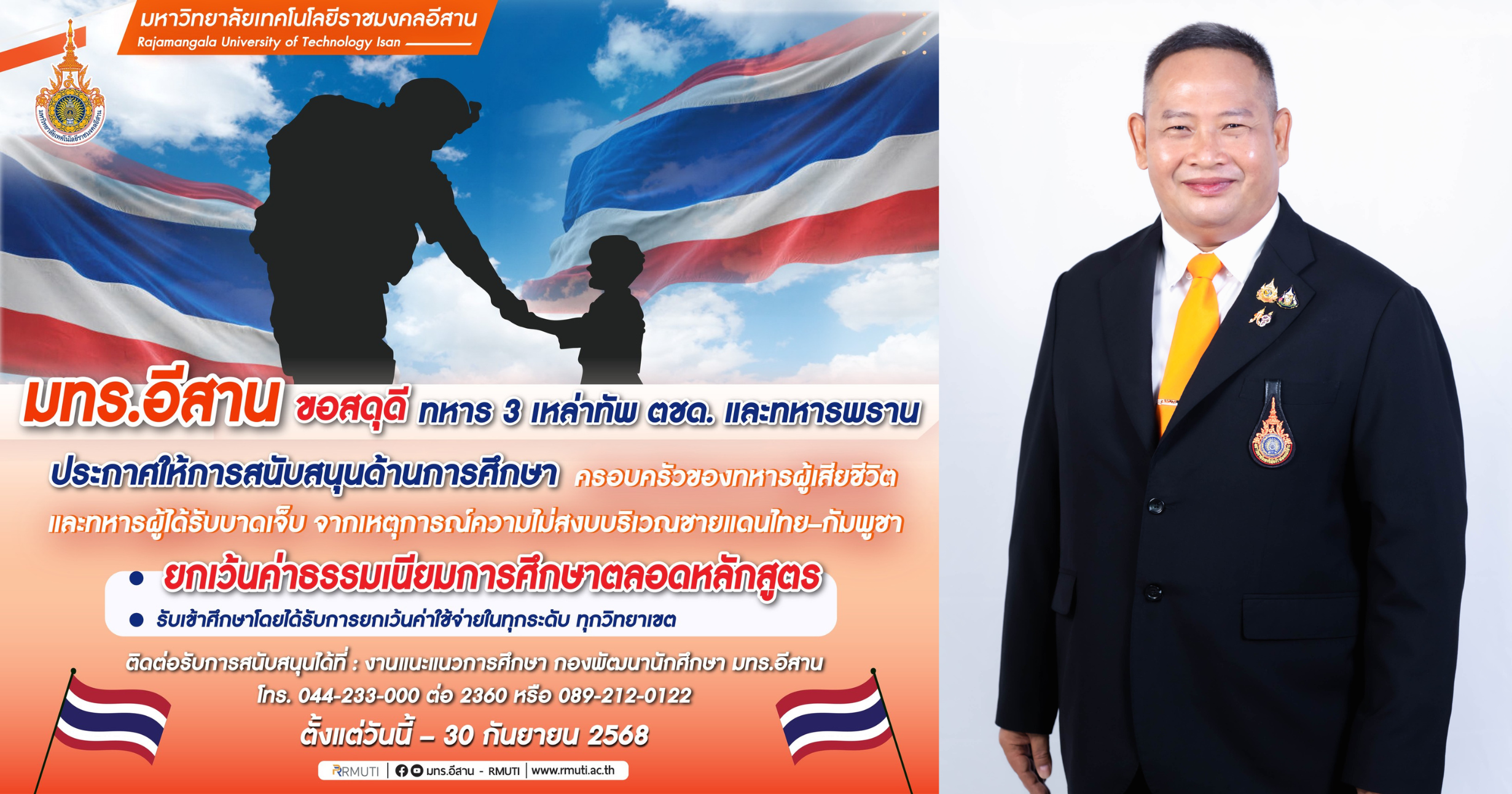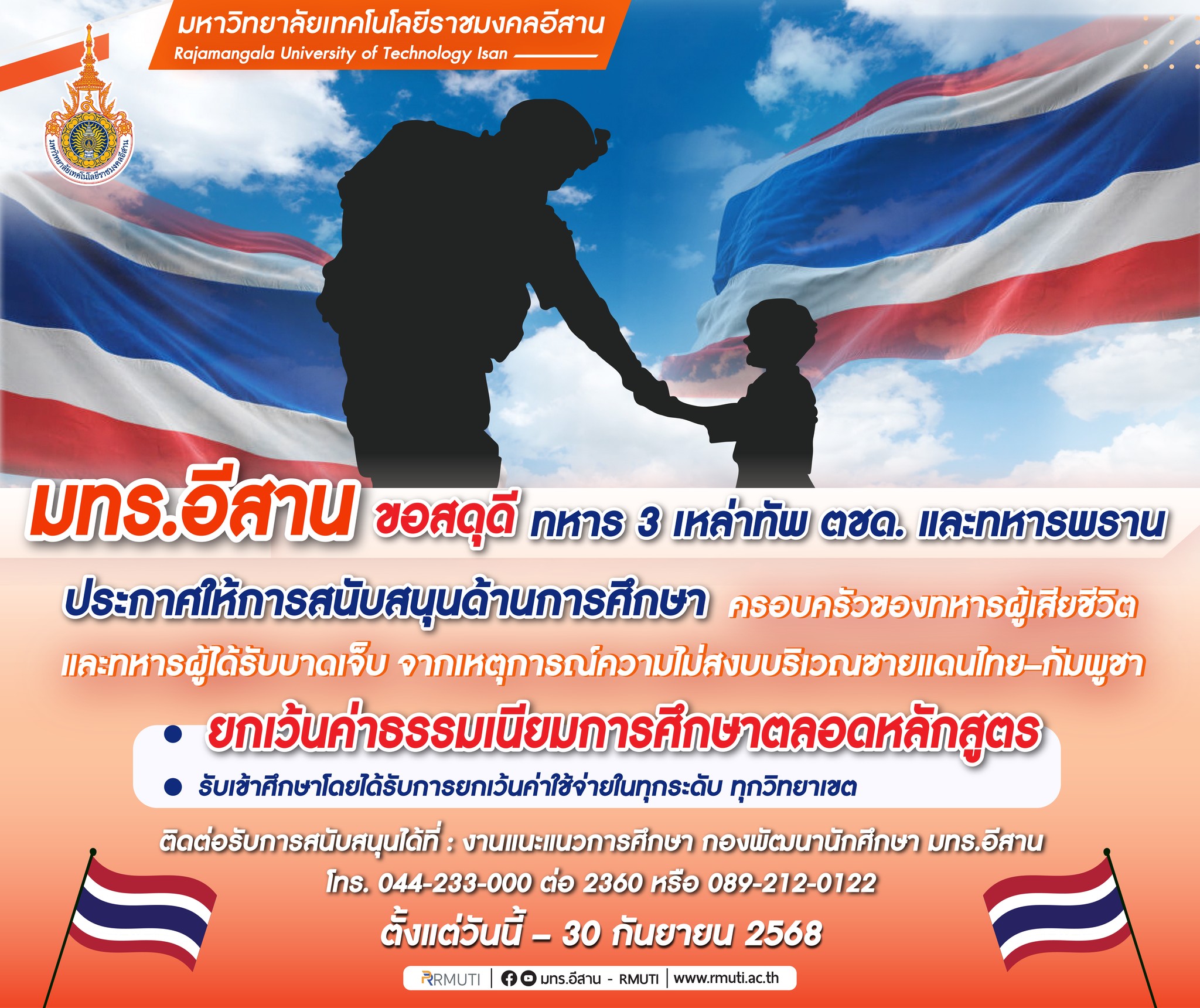 มทร.อีสาน ให้การสนับสนุนด้านการศึกษาแก่ครอบครัวทหารผู้เสียชีวิต และบาดเจ็บจากเหตุการณ์ชายแดนไทย – กัมพูชา Posted by radio895 Last Updated: August 9, 2025 มหาวิทยาลัยเทคโนโลยีราชมงคลอีสาน โดย รองศาสตราจารย์ ดร.โฆษิต ศรีภูธร อธิการบดี มทร.อีสาน ประกาศนโยบายให้การสนับสนุนด้านการศึกษาแก่บุตรหลานของทหารที่เสียชีวิตหรือได้รับบาดเจ็บจากเหตุการณ์ความไม่สงบบริเวณชายแดนไทย–กัมพูชา โดยมหาวิทยาลัยพร้อมยกเว้นค่าธรรมเนียมการศึกษาตลอดหลักสูตร รวมถึงไม่เรียกเก็บค่าใช้จ่ายต่าง ๆ ตลอดระยะเวลาการศึกษาในทุกระดับและทุกวิทยาเขตของมหาวิทยาลัย โดยนโยบายดังกล่าวเป็นส่วนหนึ่งของความมุ่งมั่นในการแสดงความกตัญญูต่อผู้ปฏิบัติหน้าที่เพื่อประเทศชาติ และสนับสนุนโอกาสทางการศึกษาให้กับครอบครัวของผู้เสียสละ เพื่อให้บุตรหลานของทหารเหล่านั้นได้รับโอกาสในการเรียนรู้ พัฒนาศักยภาพ และเติบโตเป็นกำลังสำคัญของสังคมต่อไป . อมรเทพ ดอกสันเทียะ งานประชาสัมพันธ์และเผยแพร่ มทร.อีสาน รายงาน 042A6489527718445_1080036247653493_5943380738476625106_nสำเนาของ ปก – ทุนทหารชายแดน popular posts ราชมงคลธัญบุรี ชวนร่วมชมและเชียร์ทัพนักกีฬาในการแข่งขันกีฬามหาวิทยาลัยแห่งประเทศไทย ครั้งที่ 51 รอบคัดเลือก เขตภาคกลาง “ธัญบุรีเกมส์” 16 – 20 พ.ย.นี้ สถานีวิทยุราชมงคลธัญบุรี เปิดรับสมัคร เจ้าหน้าที่ประชาสัมพันธ์ FIN TALK [EP.113] ชีวิตติดแอปฯ กับ Embedded Finance : ใช้จ่ายง่าย แต่หนี้ร้ายกว่าเดิม เพลินภาษานานาสาระ l ธรรมเนียมการฝังรก radio895 August 9, 2025