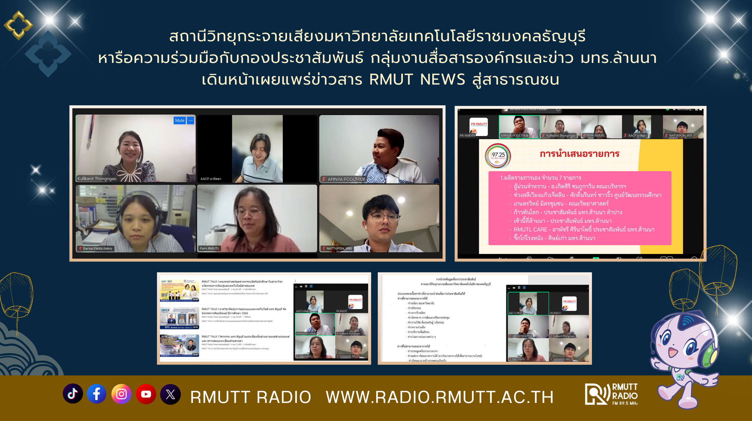 ทั้งนี้ ทั้งสองหน่วยงานได้มีความร่วมมือในการส่งต่อข่าวสารระหว่างกันมาอย่างต่อเนื่องและยาวนาน การประชุมในครั้งนี้ถือเป็นการกระชับความร่วมมือ และวางเป้าหมายที่จะเผยแพร่ข่าวสารของ มทร.ล้านนา ผ่านช่องทางสถานีวิทยุ มทร.ธัญบุรี ให้มากยิ่งขึ้น ทั้งในช่วงข่าวต้นชั่วโมงทางวิทยุกระจายเสียง เวลา 10.00 น. และ 17.00 น. ข่าวราชมงคล (RMUT NEWS) บนแพลตฟอร์มต่างๆ อาทิ Website, Tiktok และการนำเสนอในรายการต่างๆ อาทิ รายการ RMUT TALK, รายการที่นี่ RMUT