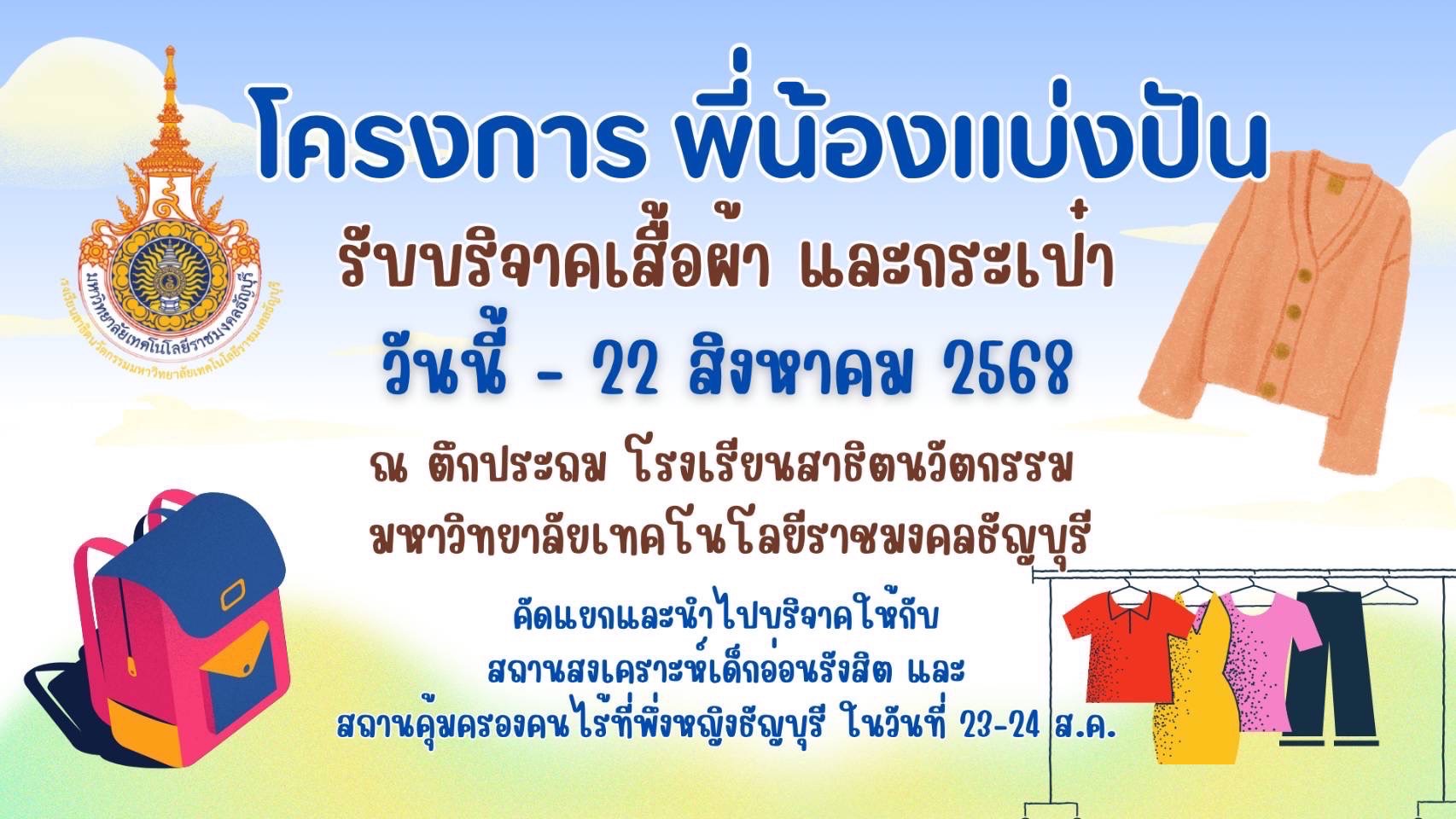 การบริจาคของท่านไม่เพียงแต่เป็นการแบ่งปันสิ่งของ แต่ยังเป็นการมอบความหวัง กำลังใจ และสร้างรอยยิ้มให้กับผู้ที่กำลังเผชิญความยากลำบาก จึงขอเชิญชวนมาร่วมเป็นส่วนหนึ่งของการสร้างสังคมแห่งการแบ่งปันที่เข้มแข็งไปด้วยกัน สอบถามรายละเอียดได้ที่ Facebook: RMUTT Innovation Demonstration School (โรงเรียนสาธิตนวัตกรรม มทร.ธัญบุรี)