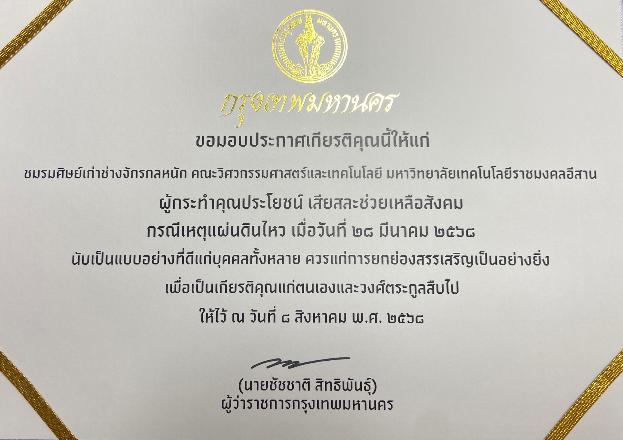 ทั้งนี้ จากเหตุการณ์แผ่นดินไหวเมื่อวันที่ 28 มีนาคม 2568 ส่งผลให้อาคารสำนักงานการตรวจเงินแผ่นดิน (สตง.) แห่งใหม่ถล่ม ศิษย์เก่าโปรแกรมวิชาช่างจักรกลหนัก วิทยาลัยนวัตกรรมวิชาชีพ มหาวิทยาลัยเทคโนโลยีราชมงคลอีสาน ได้ร่วมกันในนามชมรมศิษย์เก่าช่างจักรกลหนัก นำเครื่องมือ อุปกรณ์ด้านเครื่องจักรกลหนัก ในการรื้อถอนซากอาคารเพื่อค้นหาและช่วยเหลือผู้ประสบภัยไปสนับสนุนการทำงาน