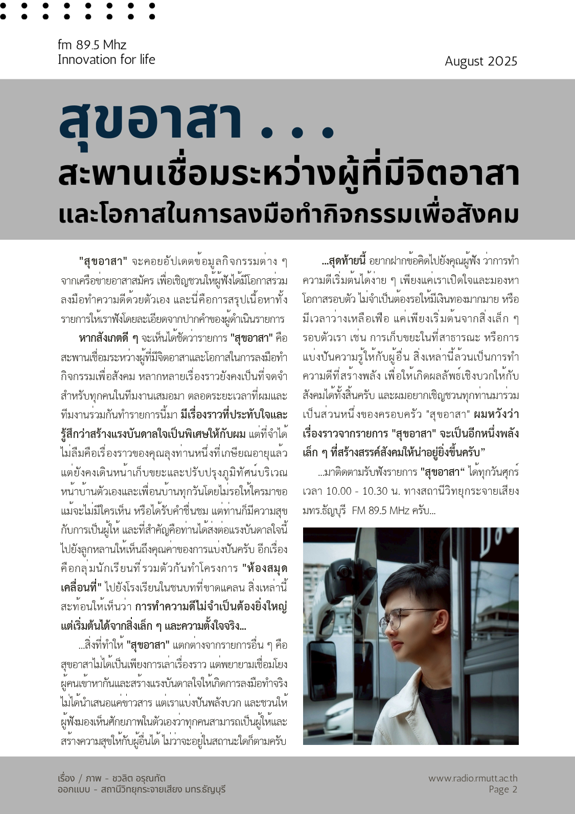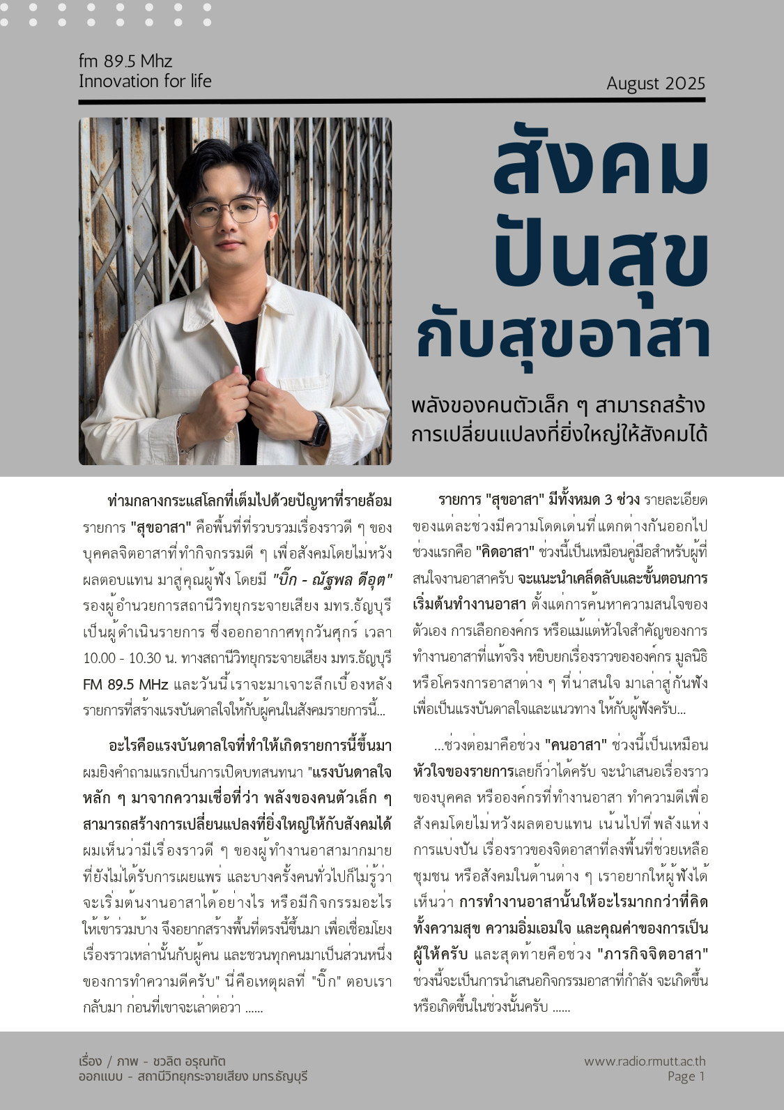 ท่ามกลางกระแสโลกที่เต็มไปด้วยปัญหาที่รายล้อม รายการ “สุขอาสา” คือพื้นที่ที่รวบรวมเรื่องราวดี ๆ ของบุคคลจิตอาสาที่ทำกิจกรรมดี ๆ เพื่อสังคมโดยไม่หวังผลตอบแทน มาสู่คุณผู้ฟัง โดยมี “บิ๊ก – ณัฐพล ดีอุต” รองผู้อำนวยการสถานีวิทยุกระจายเสียง มทร.ธัญบุรี เป็นผู้ดำเนินรายการ ซึ่งออกอากาศทุกวันศุกร์ เวลา 10.00 – 10.30 น. ทางสถานีวิทยุกระจายเสียง มทร.ธัญบุรี FM 89.5 MHz และวันนี้เราจะมาเจาะลึกเบื้องหลังรายการที่สร้างแรงบันดาลใจให้กับผู้คนในสังคมรายการนี้…